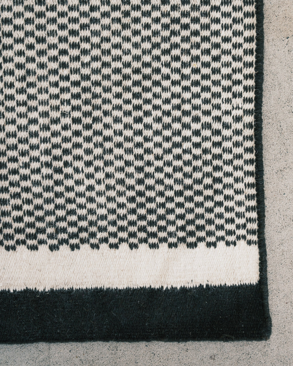 A handwoven wool carpet with a sturdy cotton warp made by village artisans in Rajasthan, India. The natural fibres of the local desert sheep make these flat-weave rugs long lasting and durable.