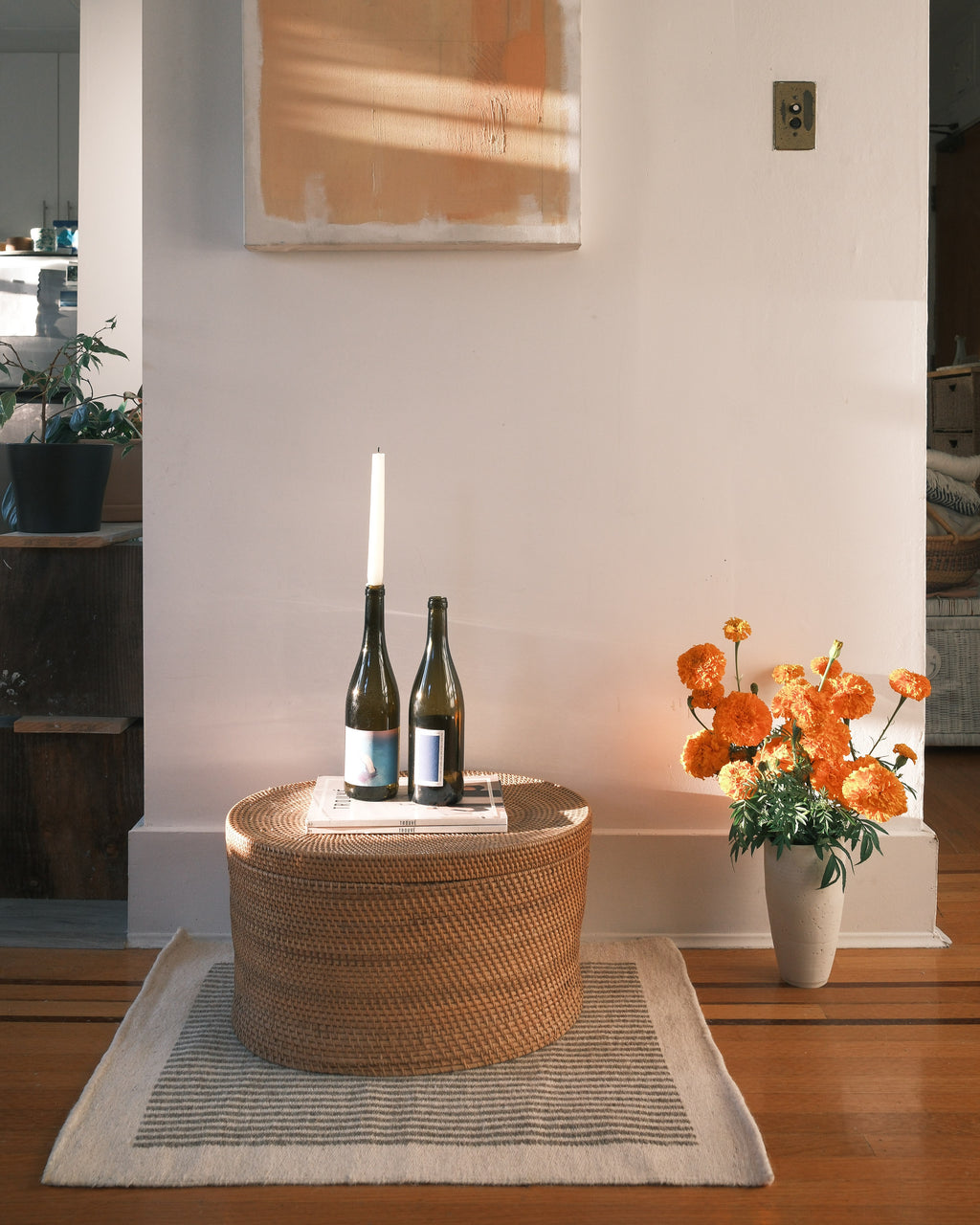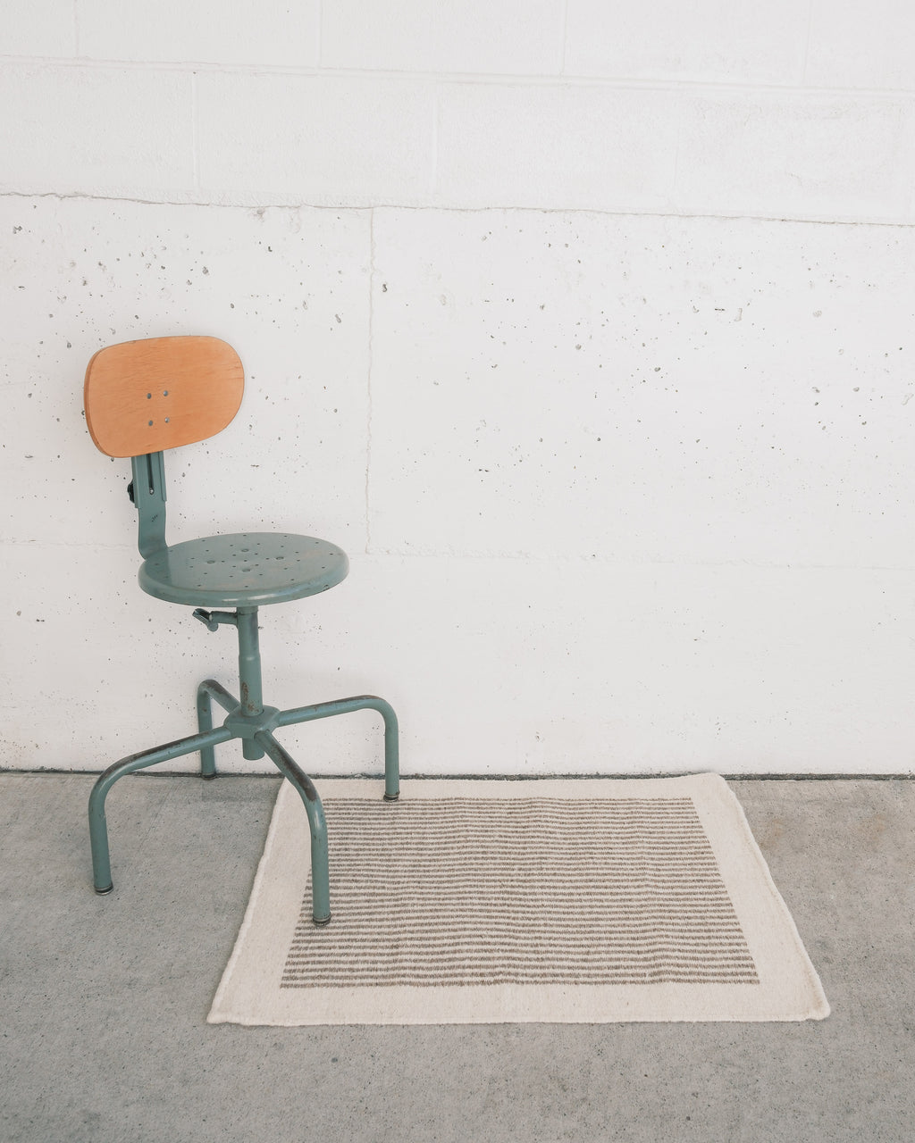 A handwoven wool carpet with a sturdy cotton warp made by village artisans in Rajasthan, India. The natural fibres of the local desert sheep make these flat-weave rugs long lasting and durable.