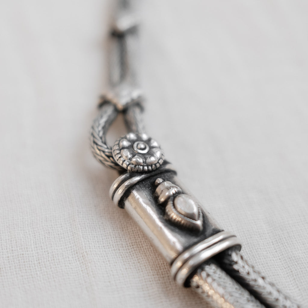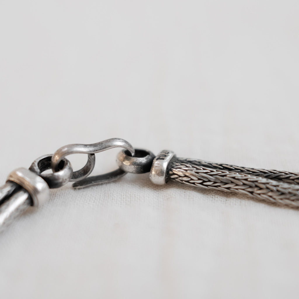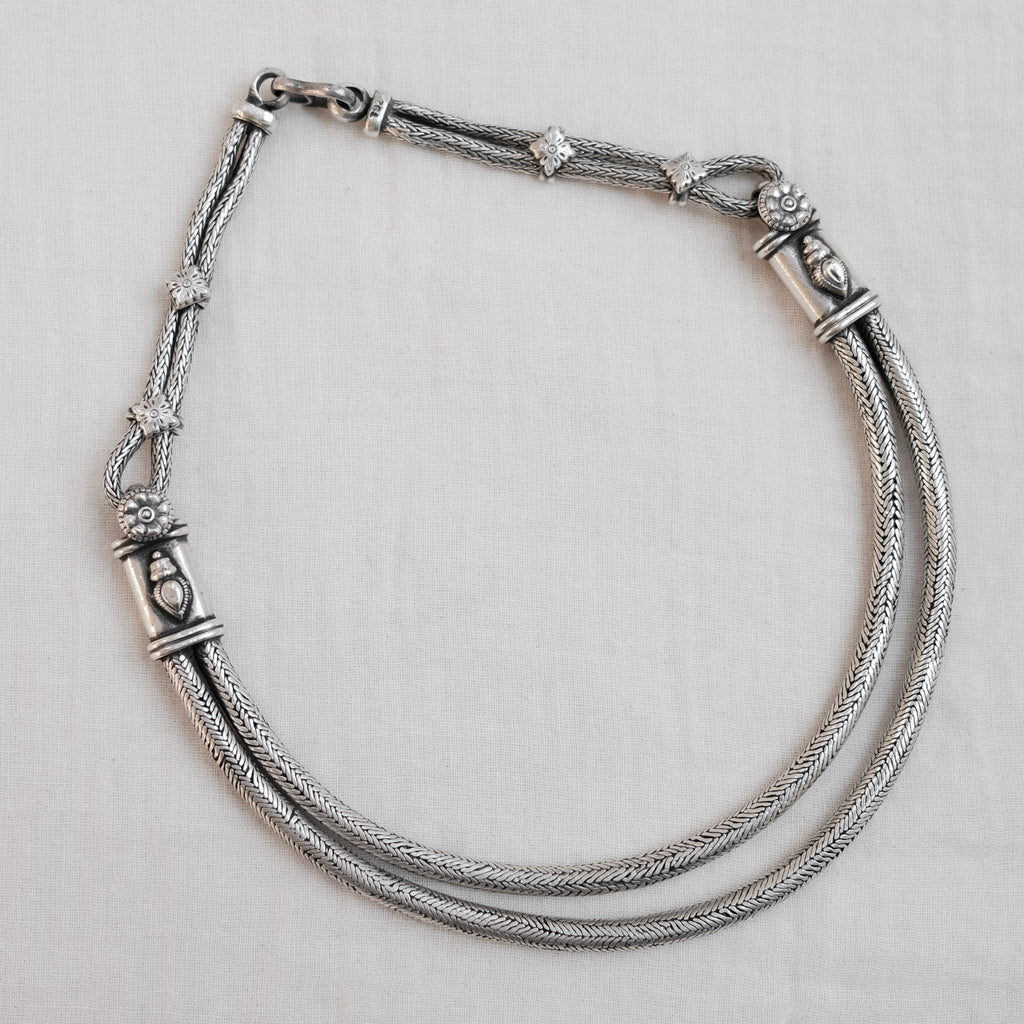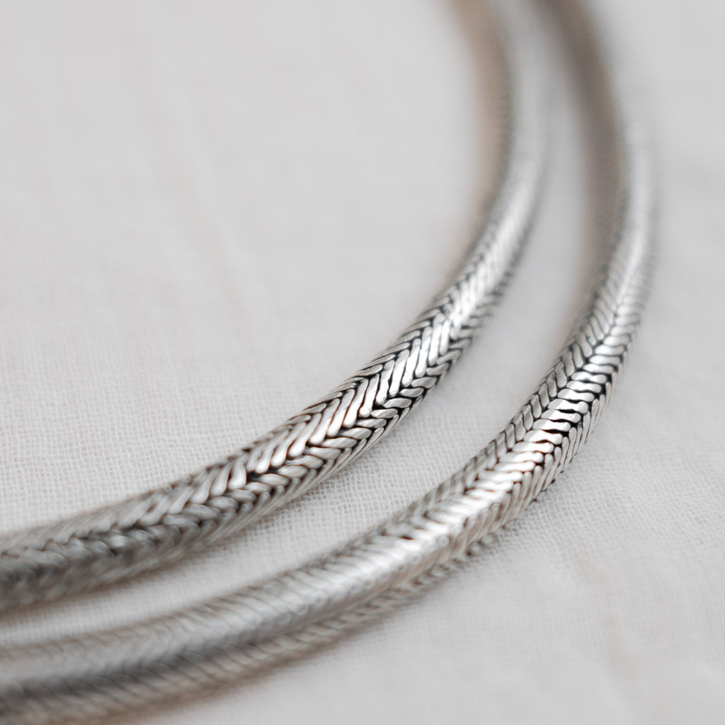 An exquisite 92.5 silver double snake chain. The genius of the snake chain design is that it makes silver drape beautifully. Sitting elegantly at the collar, this piece has unique findings to embellish and adorn the neck.