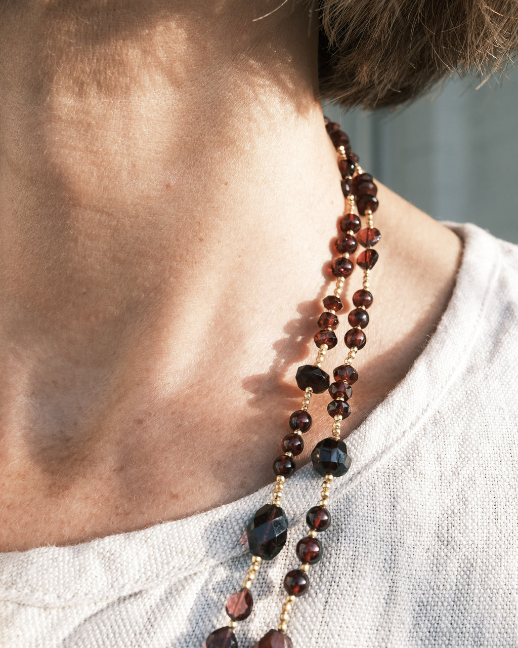 An exquisite gold plated 92.5 silver and garnet necklace. Can be worn as a single strand, doubled up or wrapped around the wrist.