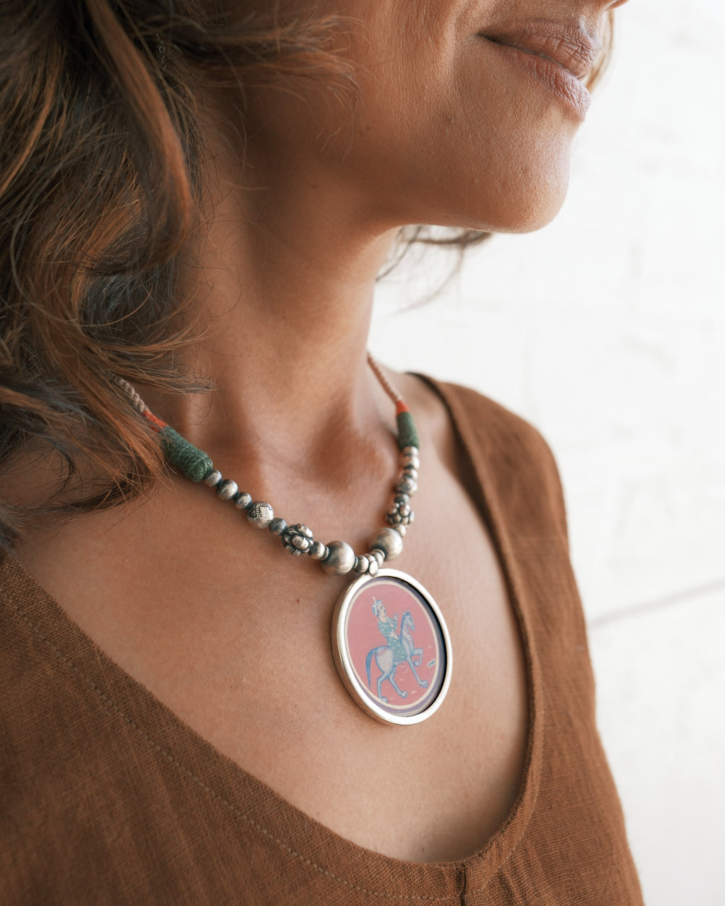 A beautiful hand painted pendant depicting a horseback rider in 92.5 silver. Paired with a necklace of tightly bound cotton thread and beads.
