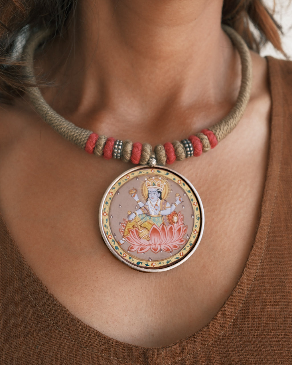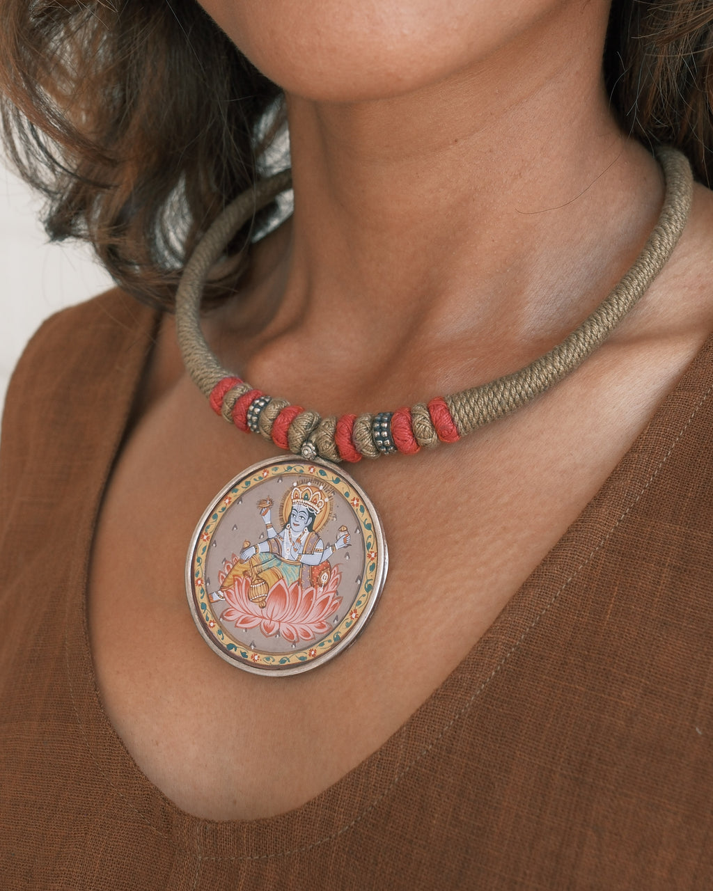 A beautiful hand painted pendant depicting Shiva set in 92.5 silver. Paired with a necklace of tightly bound cotton thread and beads.