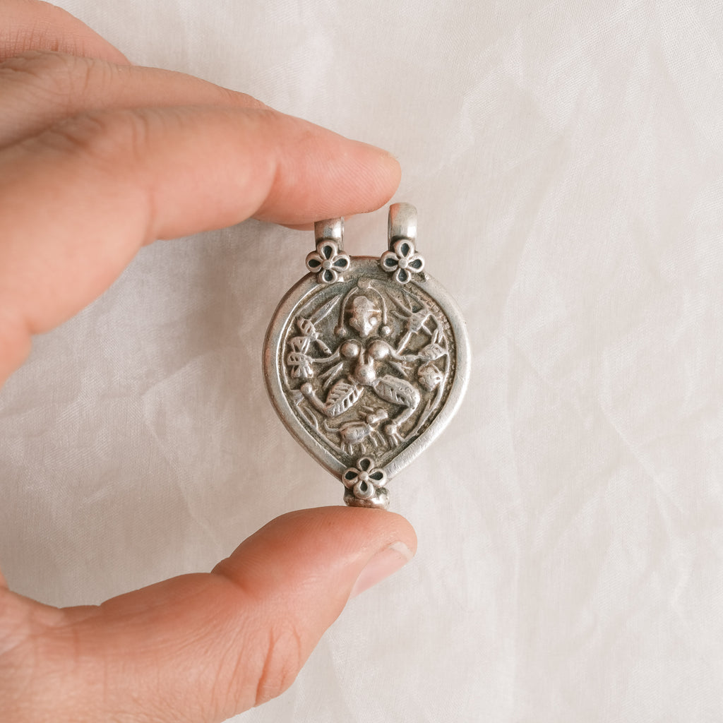 A handmade vintage silver tribal pendant, embossed with the Hindu goddess Durga. Durga symbolizes protection and strength, embodying powerful spiritual energy.
