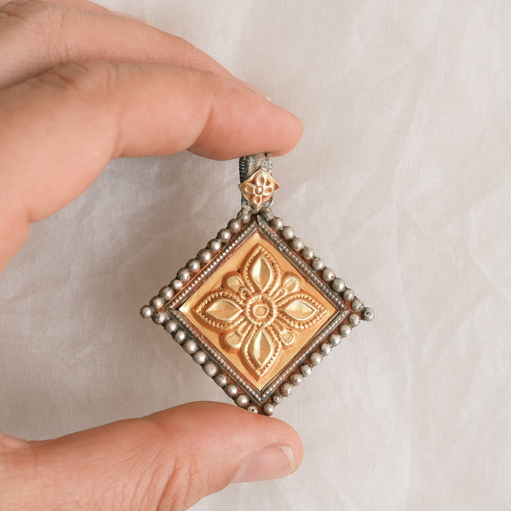 A handcrafted vintage silver pendant showcasing a floral design accented by beaded droplets and finished with gold plated details for an elegant touch.