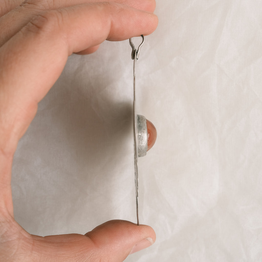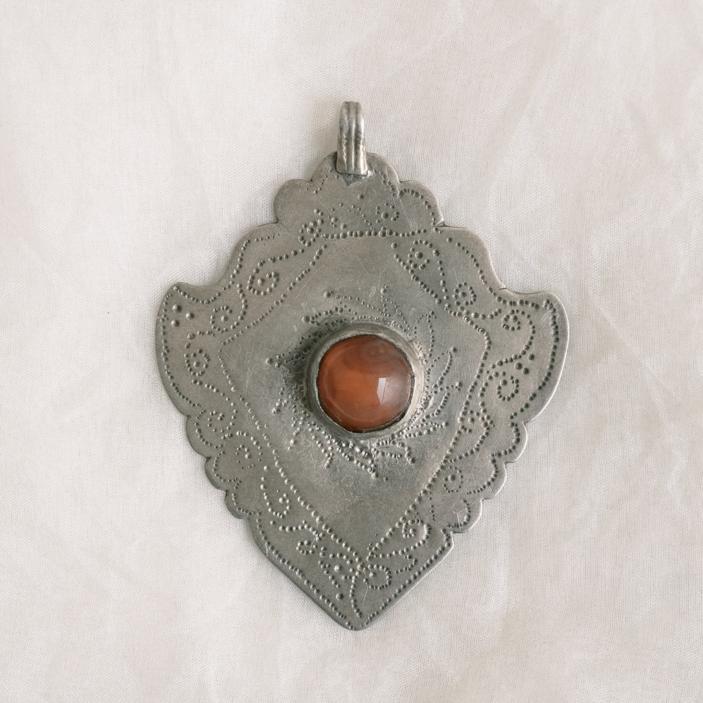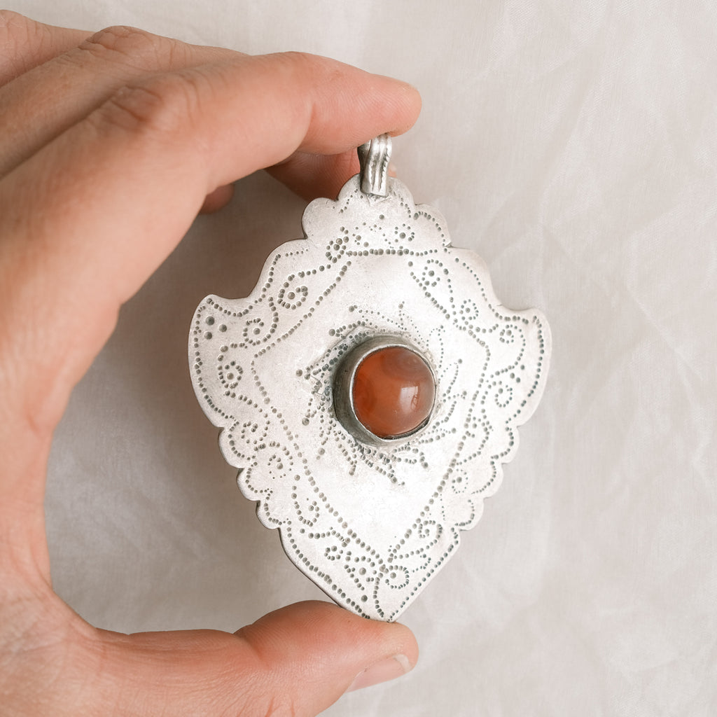 A handmade vintage silver amulet pendant, featuring a distinctive hammered design that highlights a beautifully warm-toned glass centerpiece.