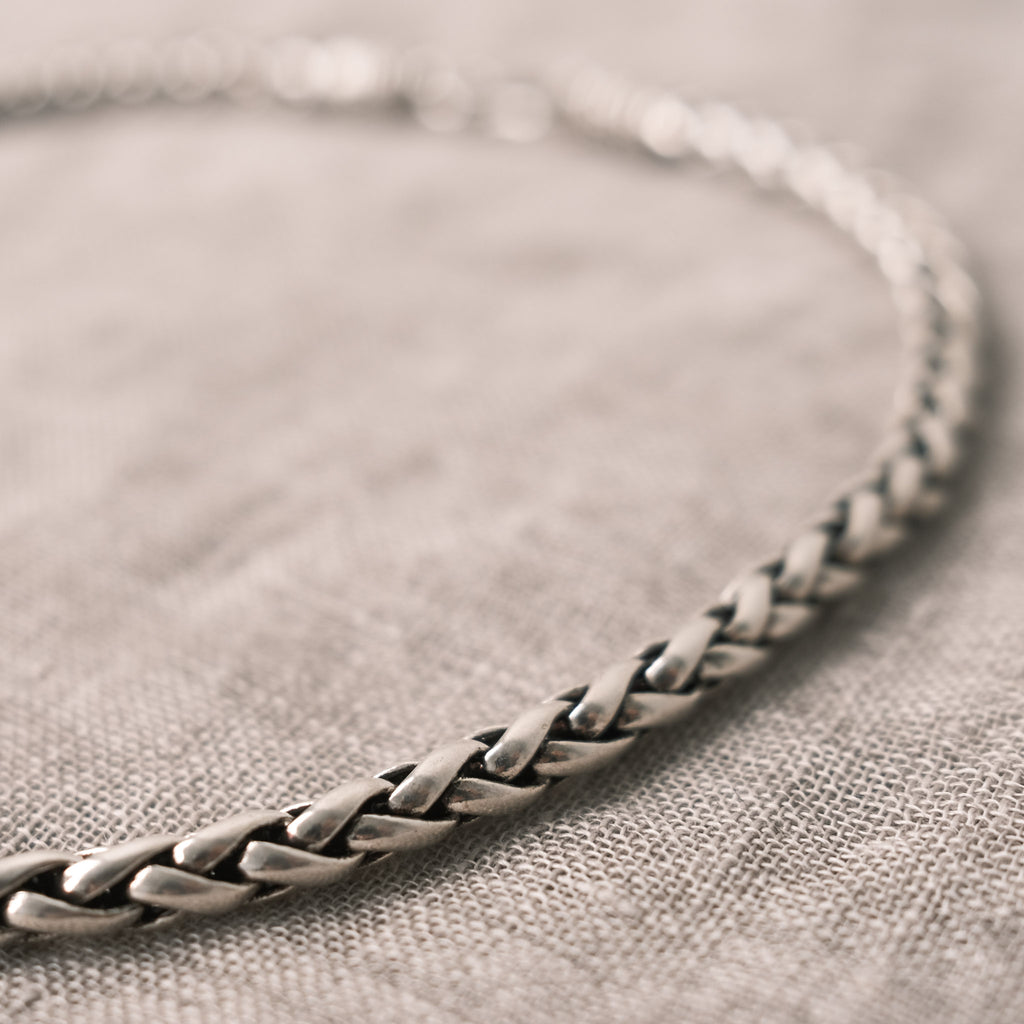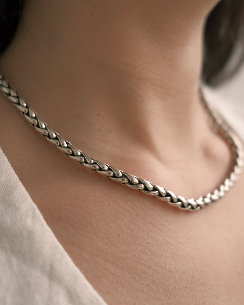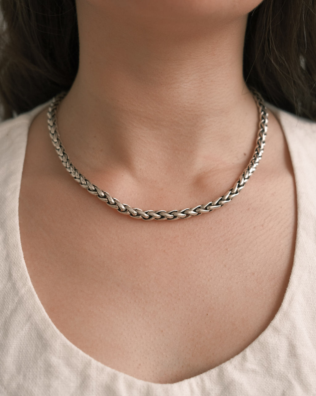 An exquisite 92.5 silver interlocking wheat chain with beautiful drape. It can easily be worn alone, or for a signature look, we love grouping different lengths together and pairing with other pieces.