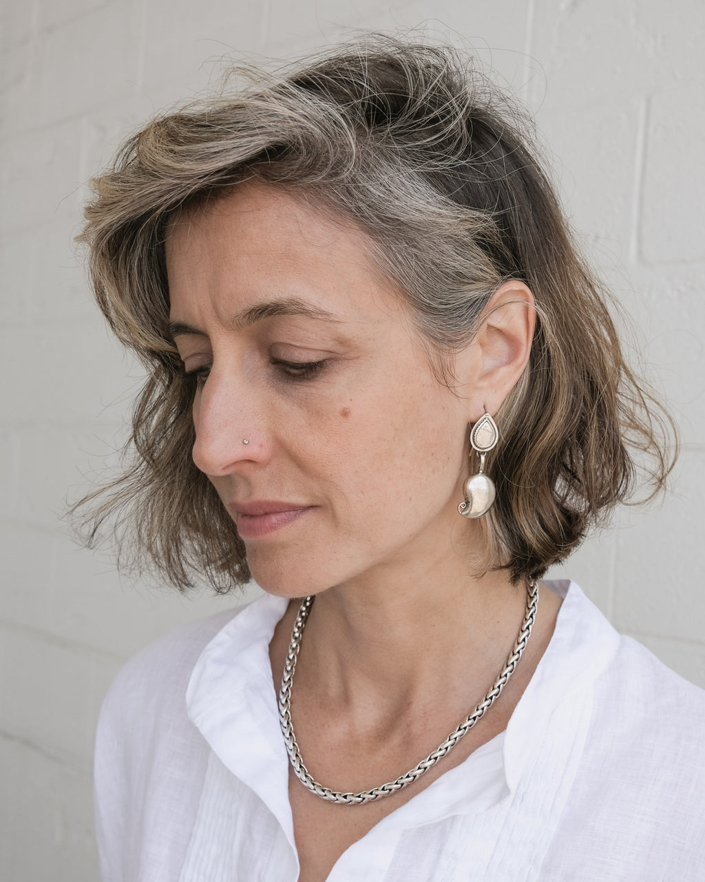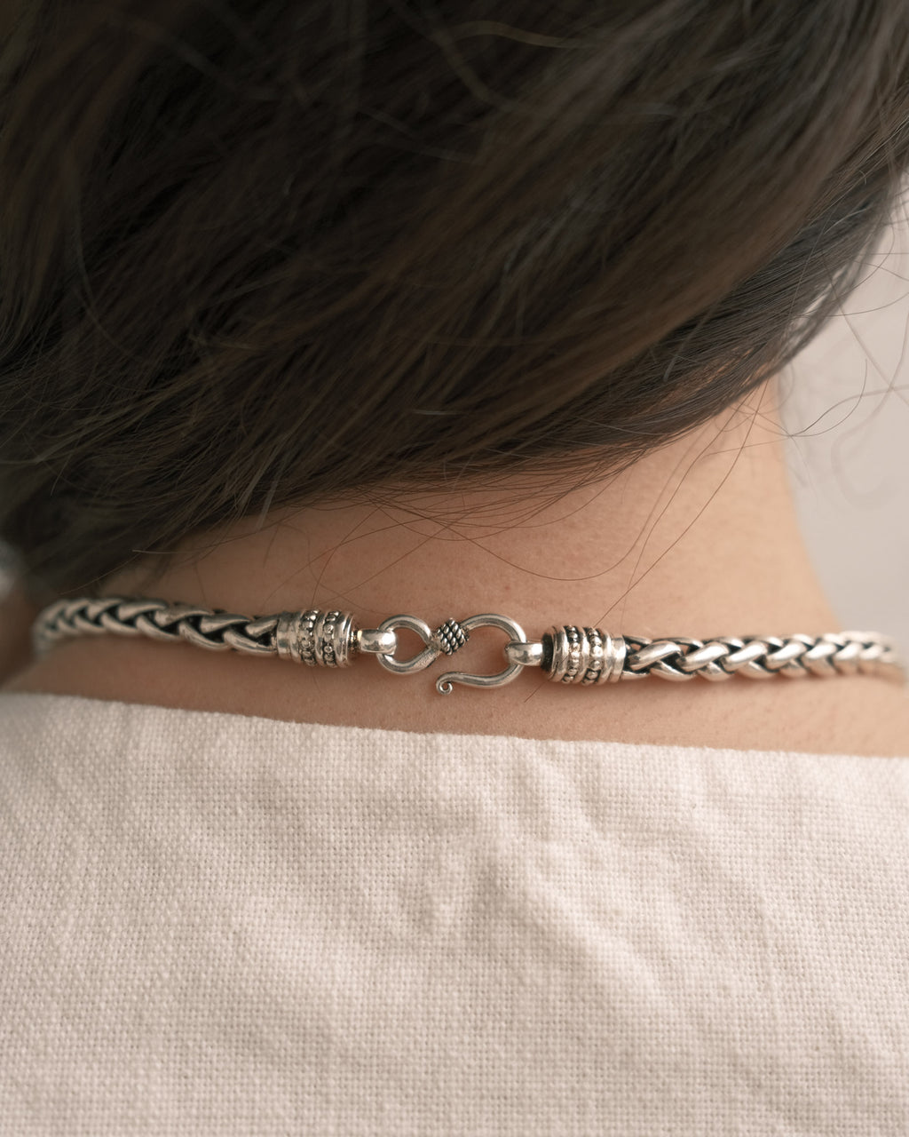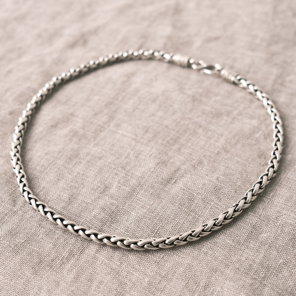An exquisite 92.5 silver interlocking wheat chain with beautiful drape. It can easily be worn alone, or for a signature look, we love grouping different lengths together and pairing with other pieces.