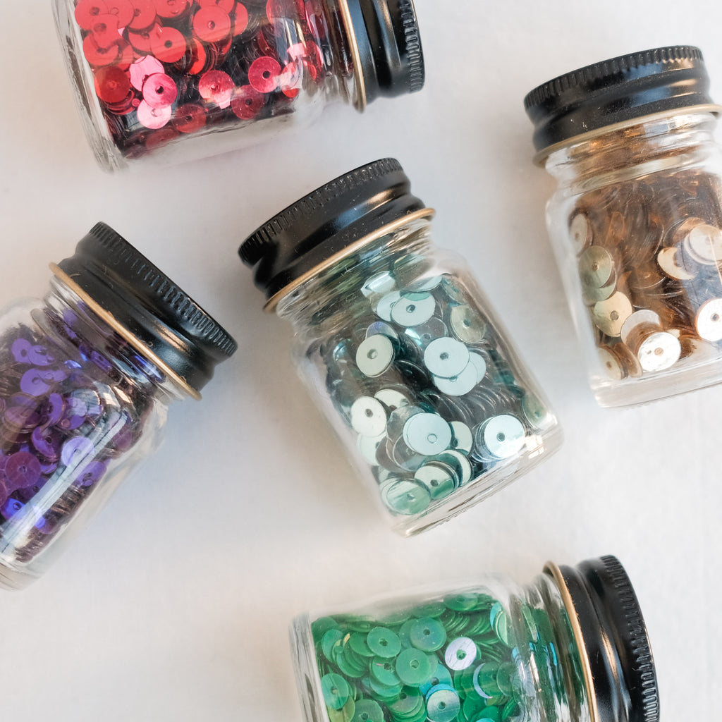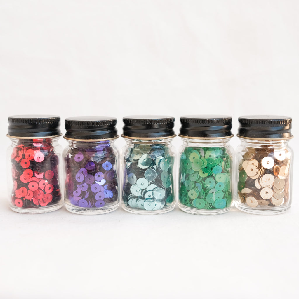 This collection includes five glass jars filled to the brim with sequins in all your favourite metallic shades.