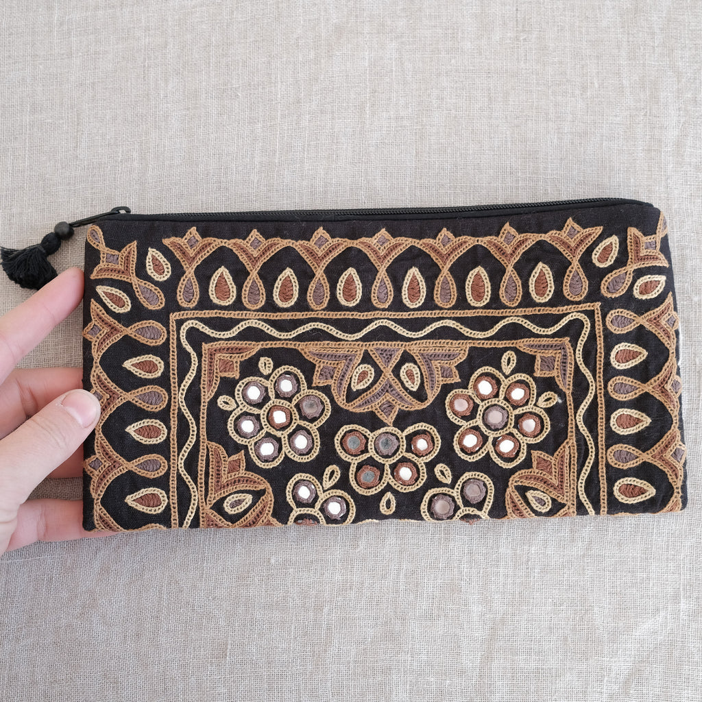 Features: Double-sided traditional embroidery, zipper closure along top, with a long inner zip pocket.