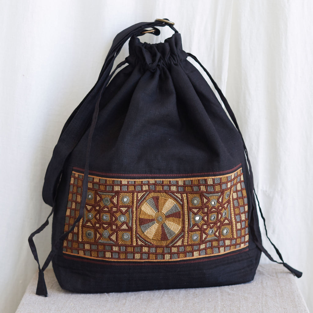 Features: A single-sided intricate traditional embroidery on a linen drawstring bag. Adjustable linen strap, drawstring closure, with an inner zip pocket.