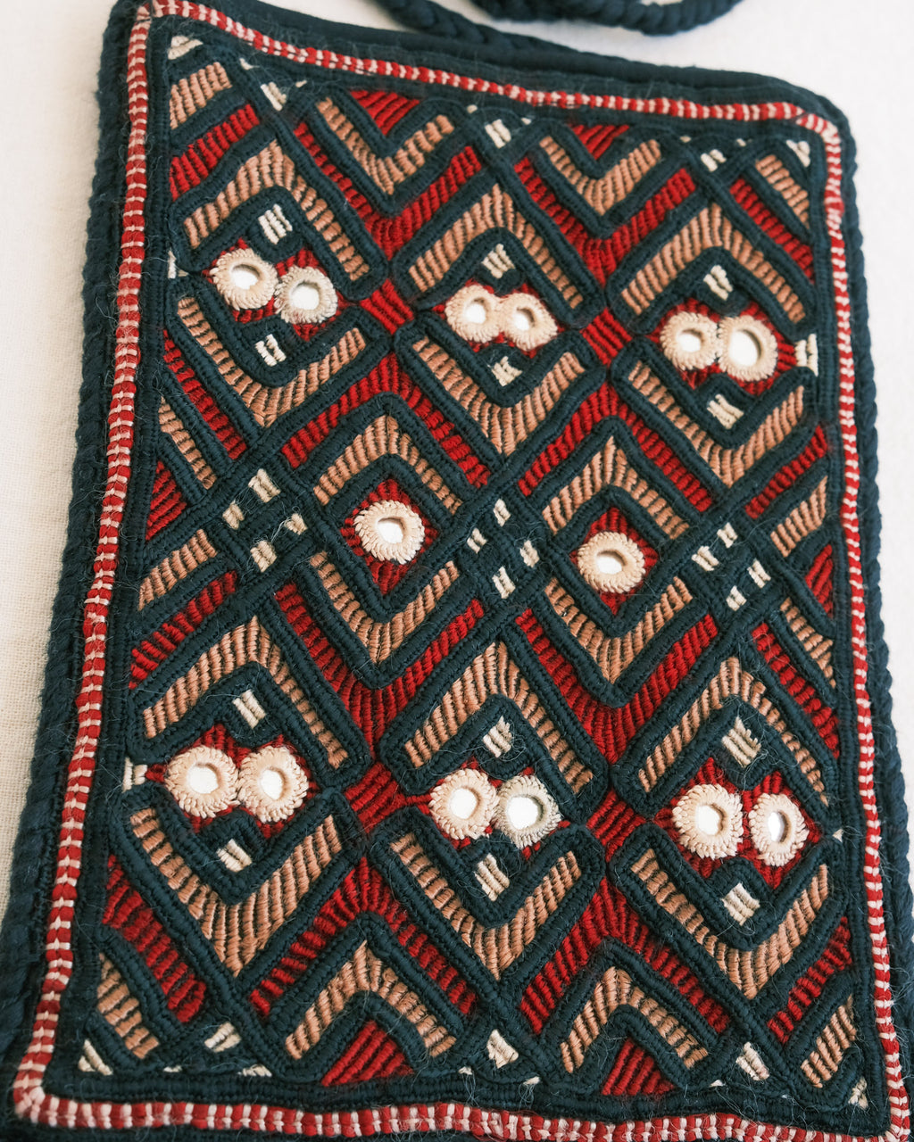 A one of a kind Jat embroidery on a small shoulder bag with a strap. The perfect little bag for your essentials on a night out or to keep a couple personal items close at hand.