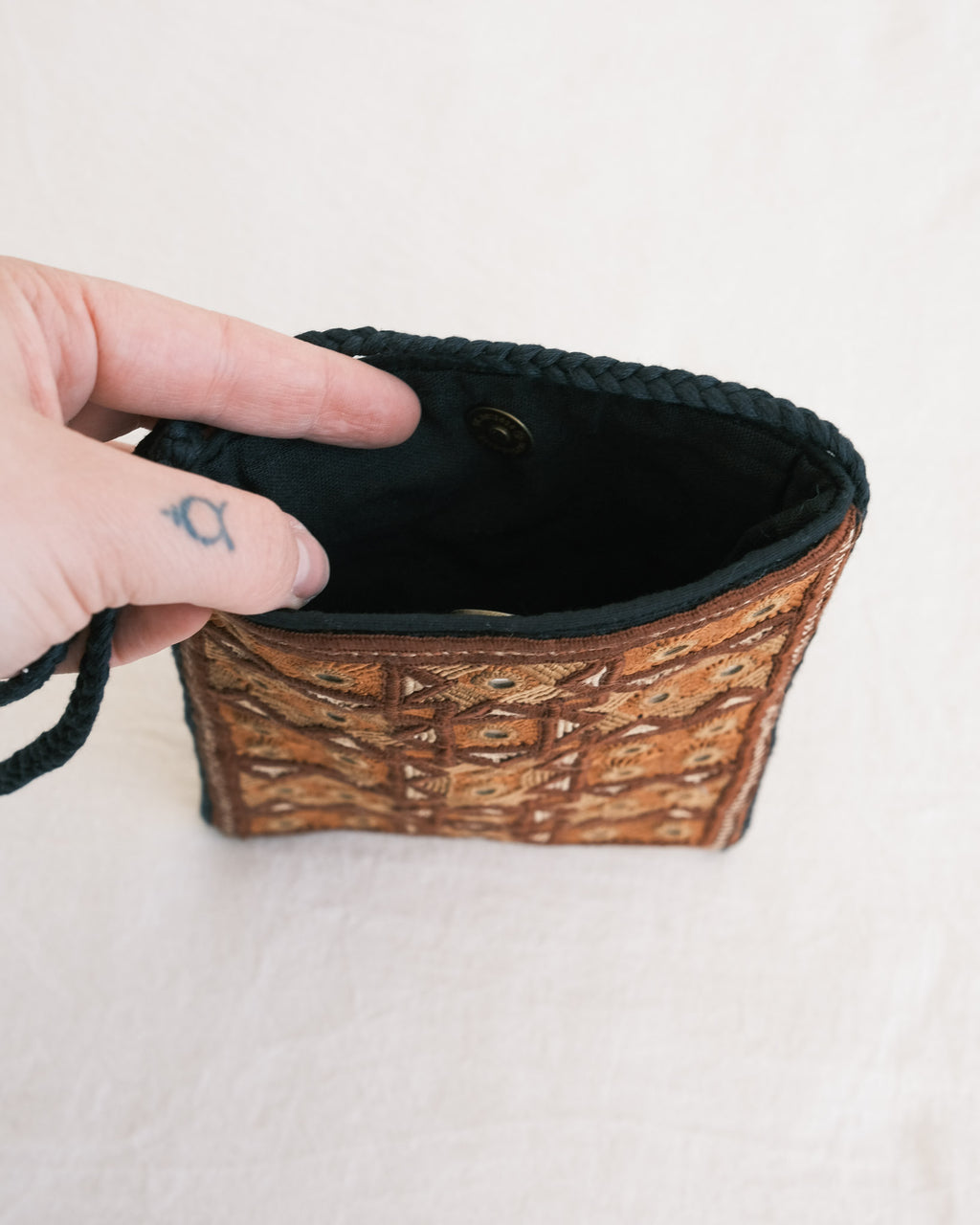 Features: Single-sided traditional embroidery on a linen shoulder bag. With a braided strap and magnetic snap closure.