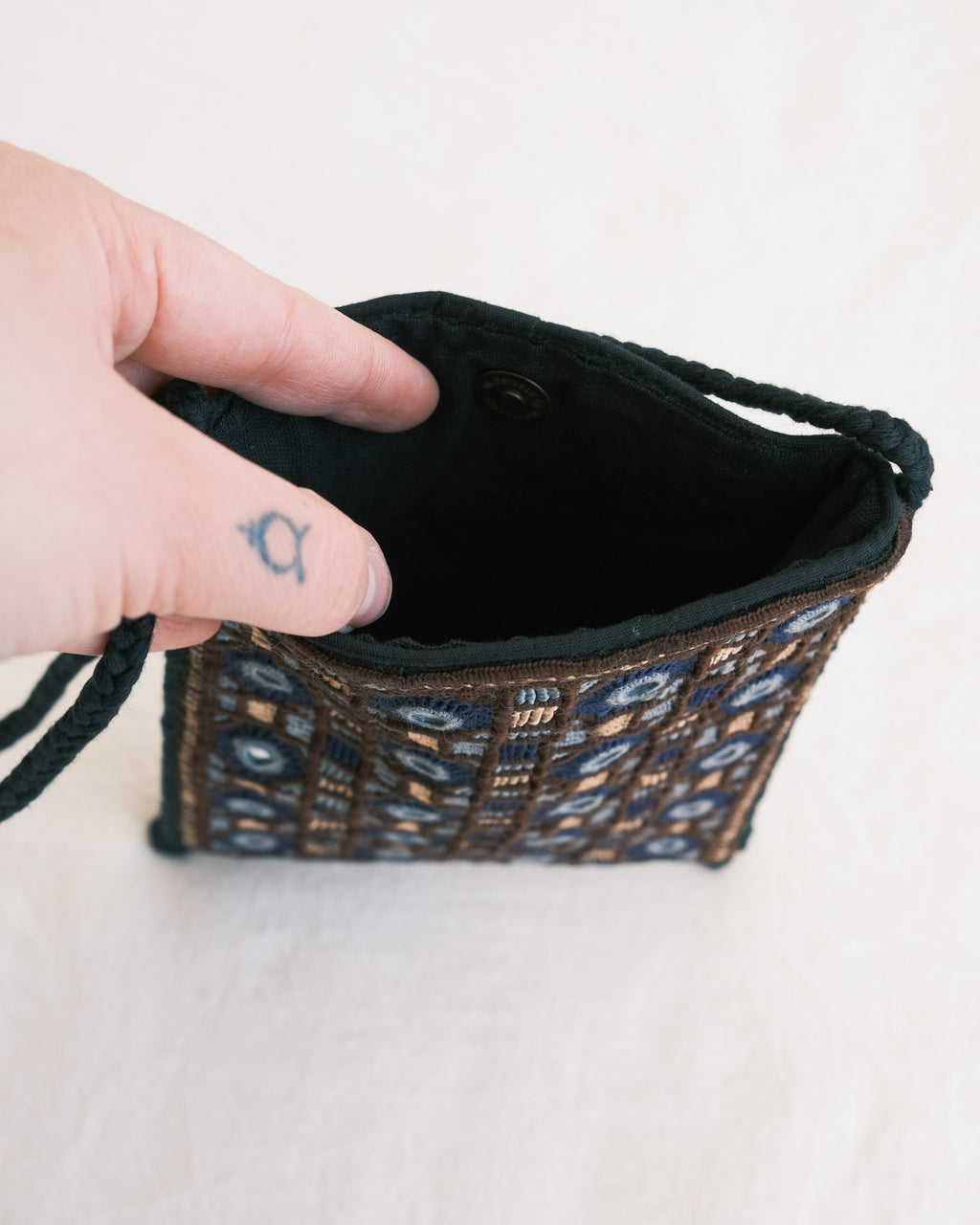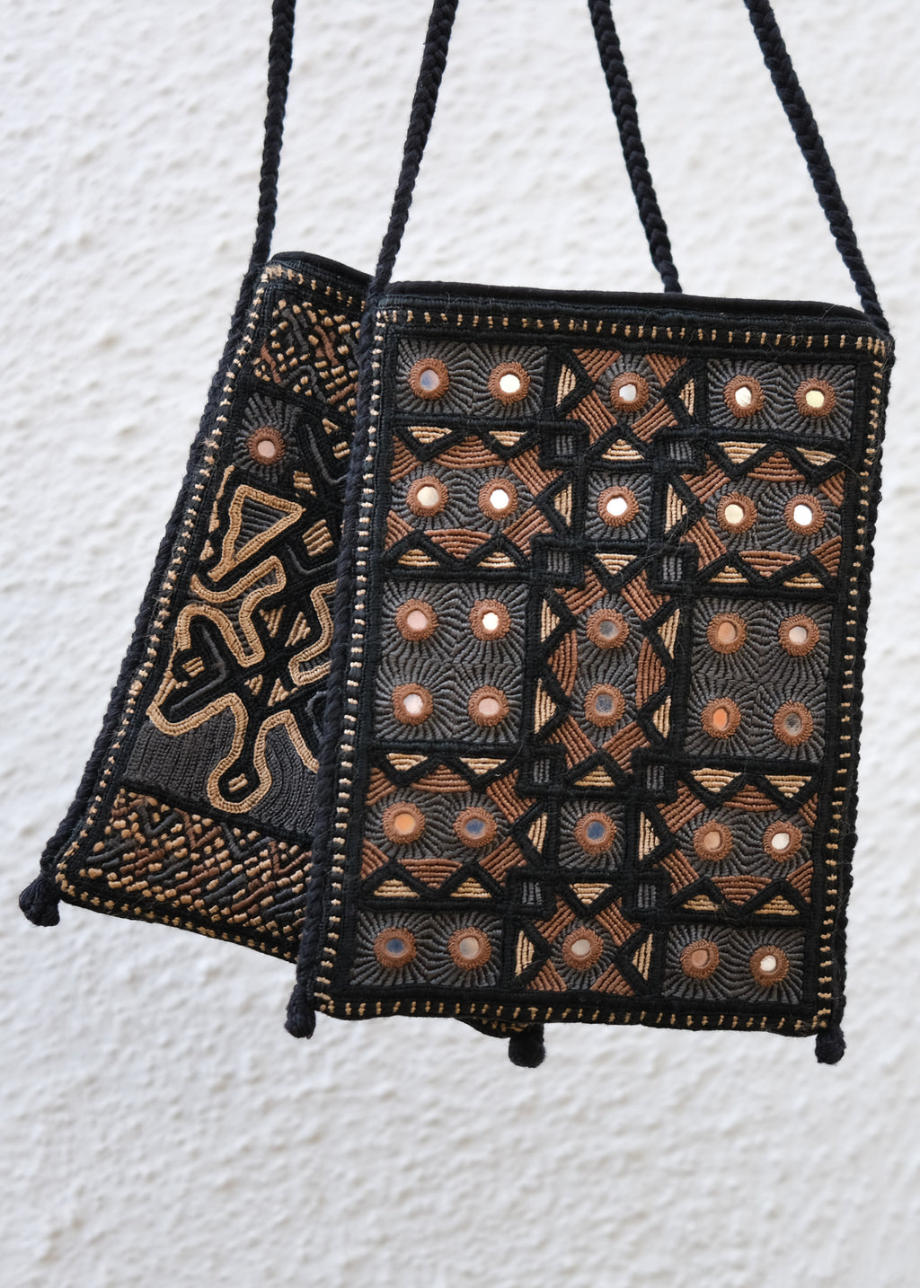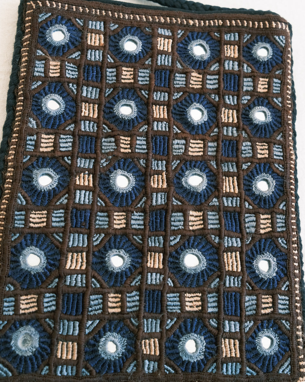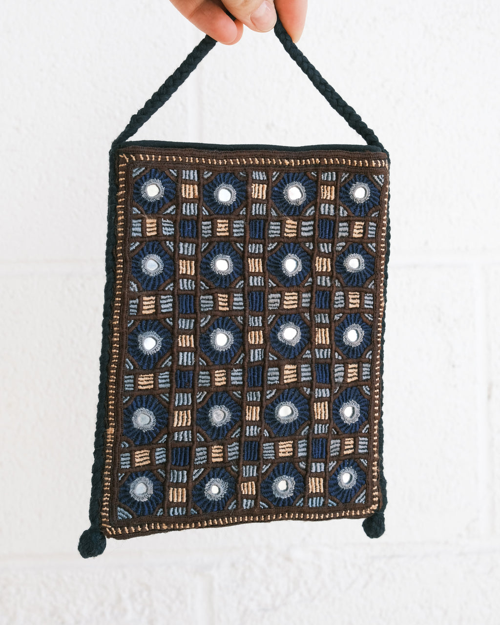 A one of a kind Jat embroidery on a small shoulder bag with a strap. The perfect little bag for your essentials on a night out or to keep a couple personal items close at hand.