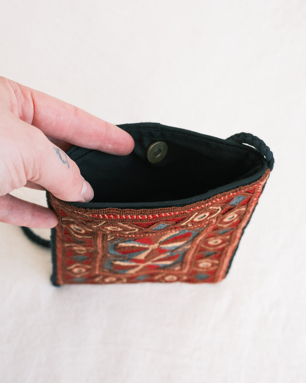 A one of a kind Jat embroidery on a small shoulder bag with a strap. The perfect little bag for your essentials on a night out or to keep a couple personal items close at hand.