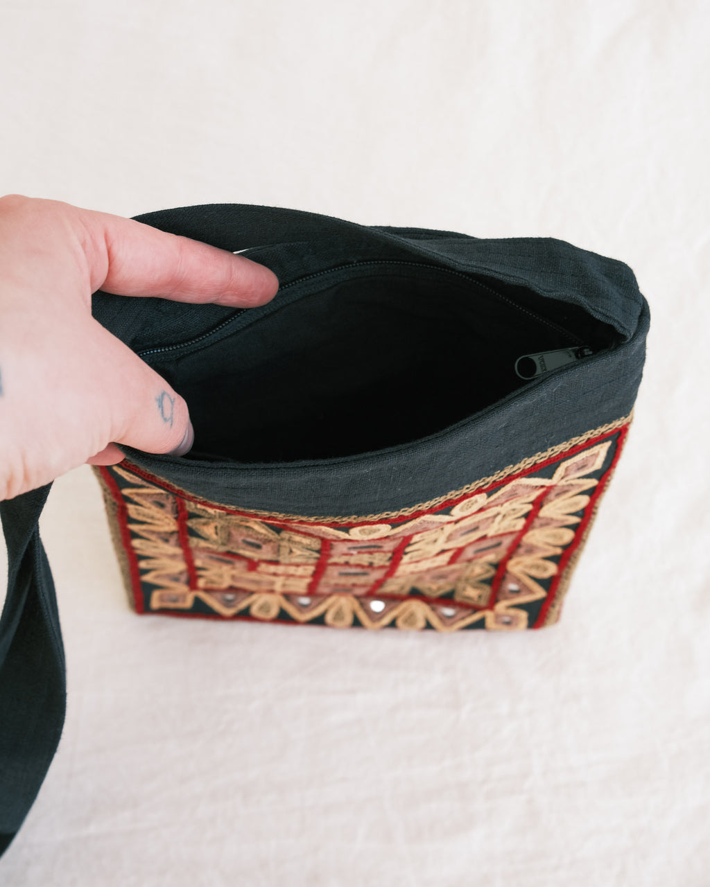 Features: Single-sided traditional embroidery on a linen bag. Zipper closure, zip pocket inside and on the back, with a linen strap.