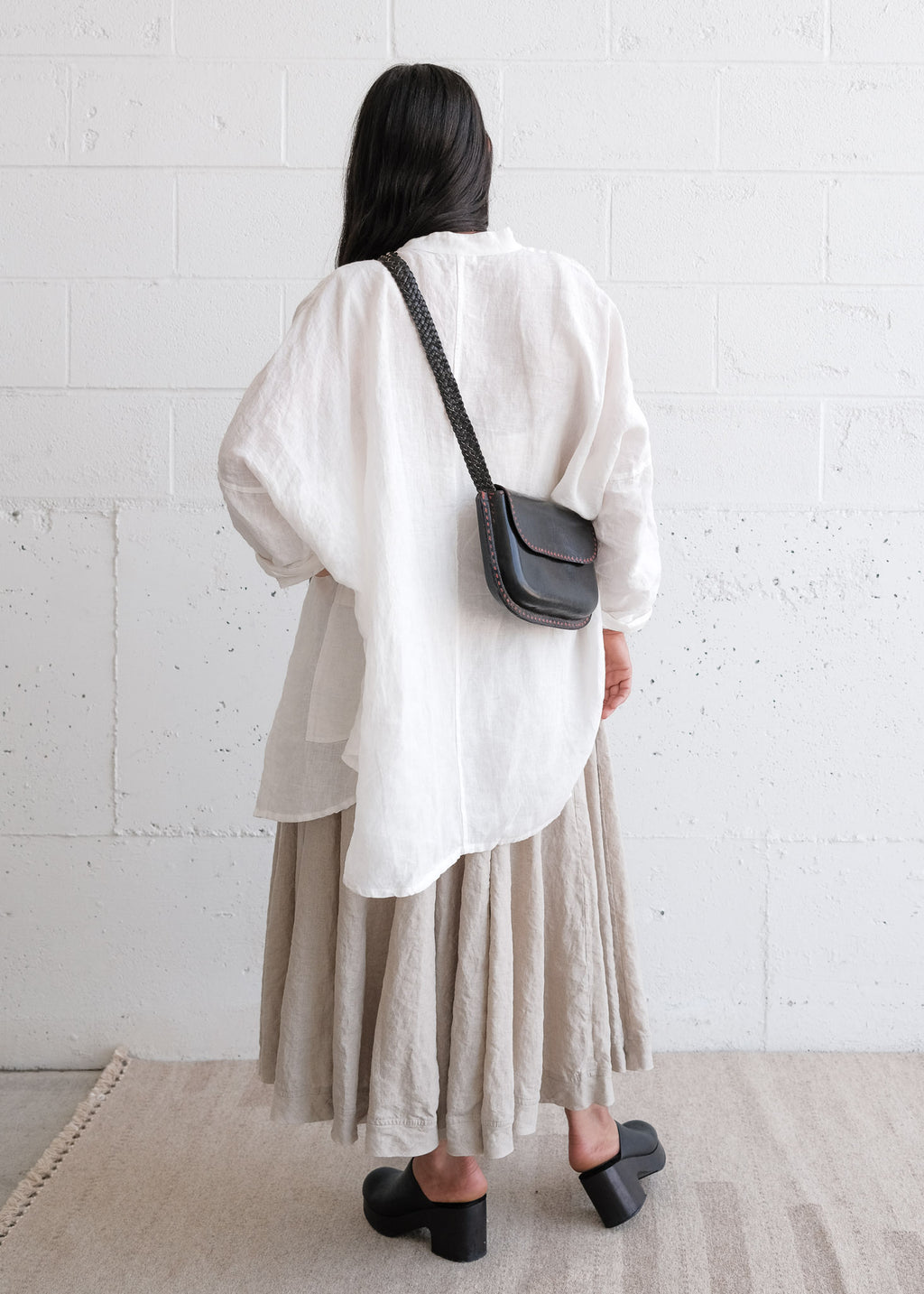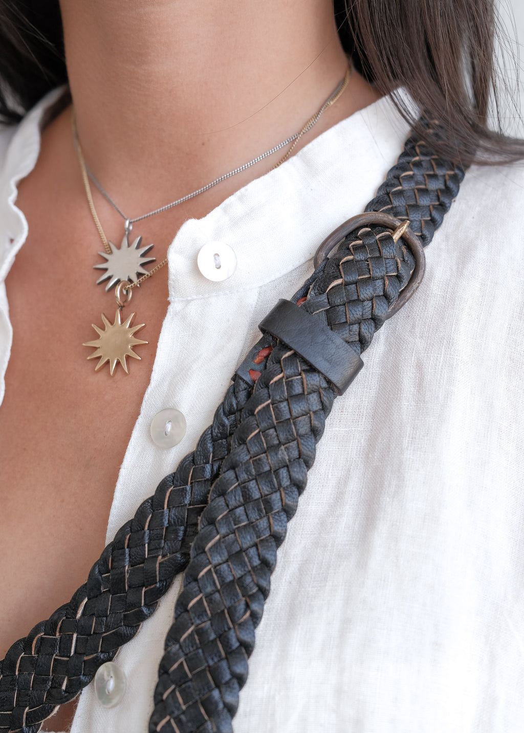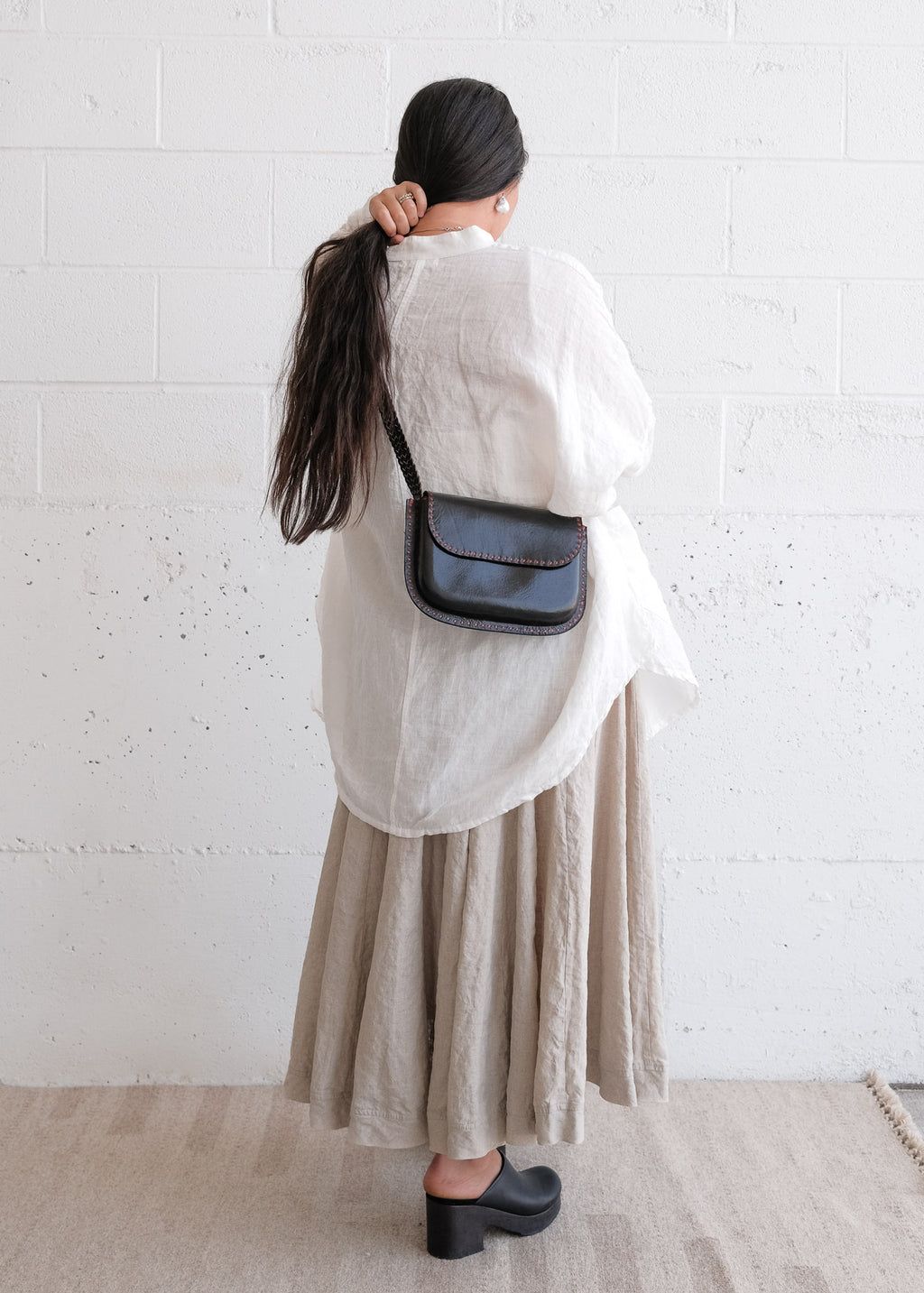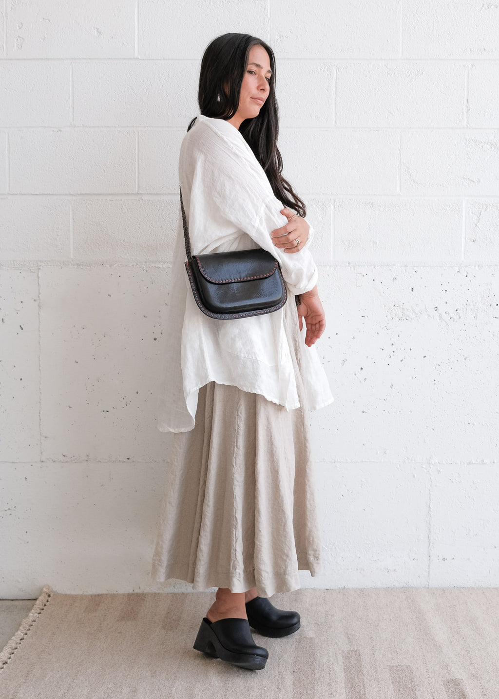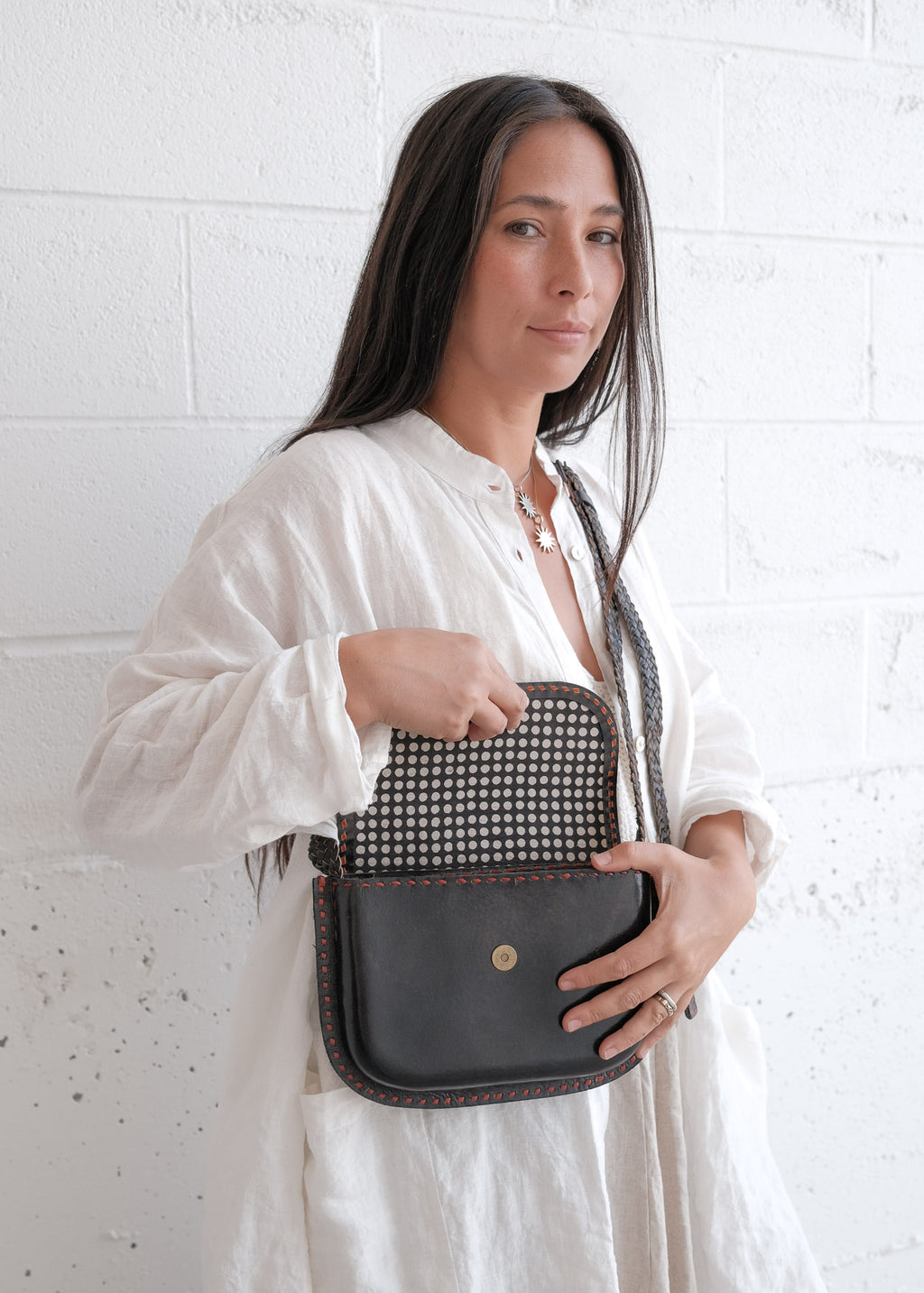 A sweet crossbody bag that will easily keep all your essentials close at hand. Featuring beautiful handstitched leather with an inner zip pocket that also functions as a divider, and a slim zipper pocket on the back. Lined with hand block printed cotton. The strap is braided so it can be adjusted to any length to make the right fit for you.