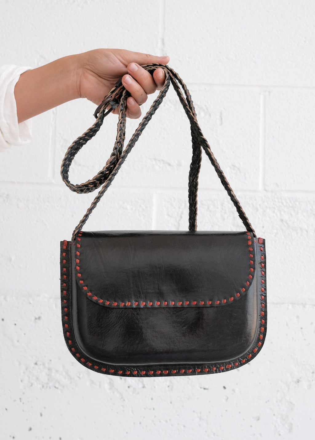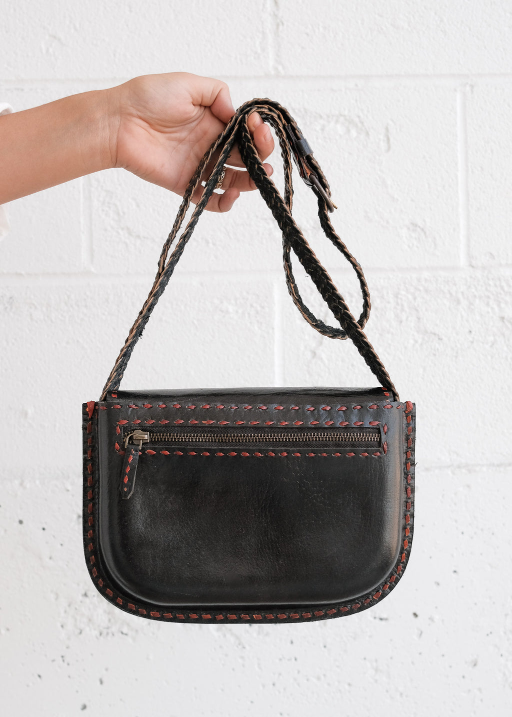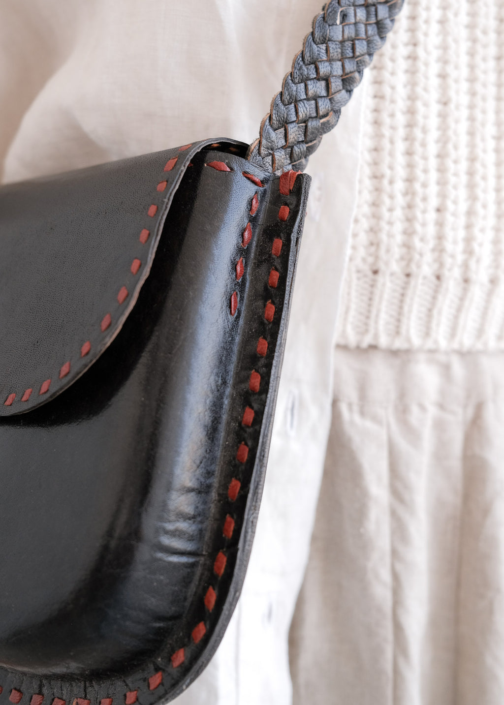 Leather Crossbody Bag - Braided - Black with Red Stitching