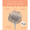 Thread your needles with ease with this stainless steel needle threader. Threaders sometimes get a bad rap because we've all broken those flimsy wire ones after a single use, but solid body threaders are regarded as the best, and these are not only functional but add a bit of beauty to your toolkit, too!  These threaders are extremely high quality, completely smooth, durable and made in Canada by Kiriki Press.