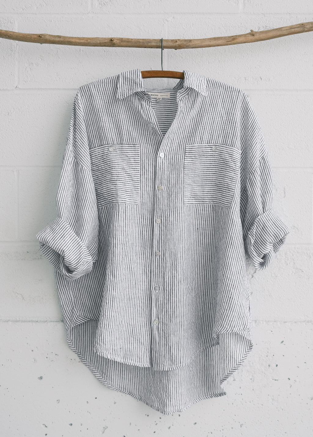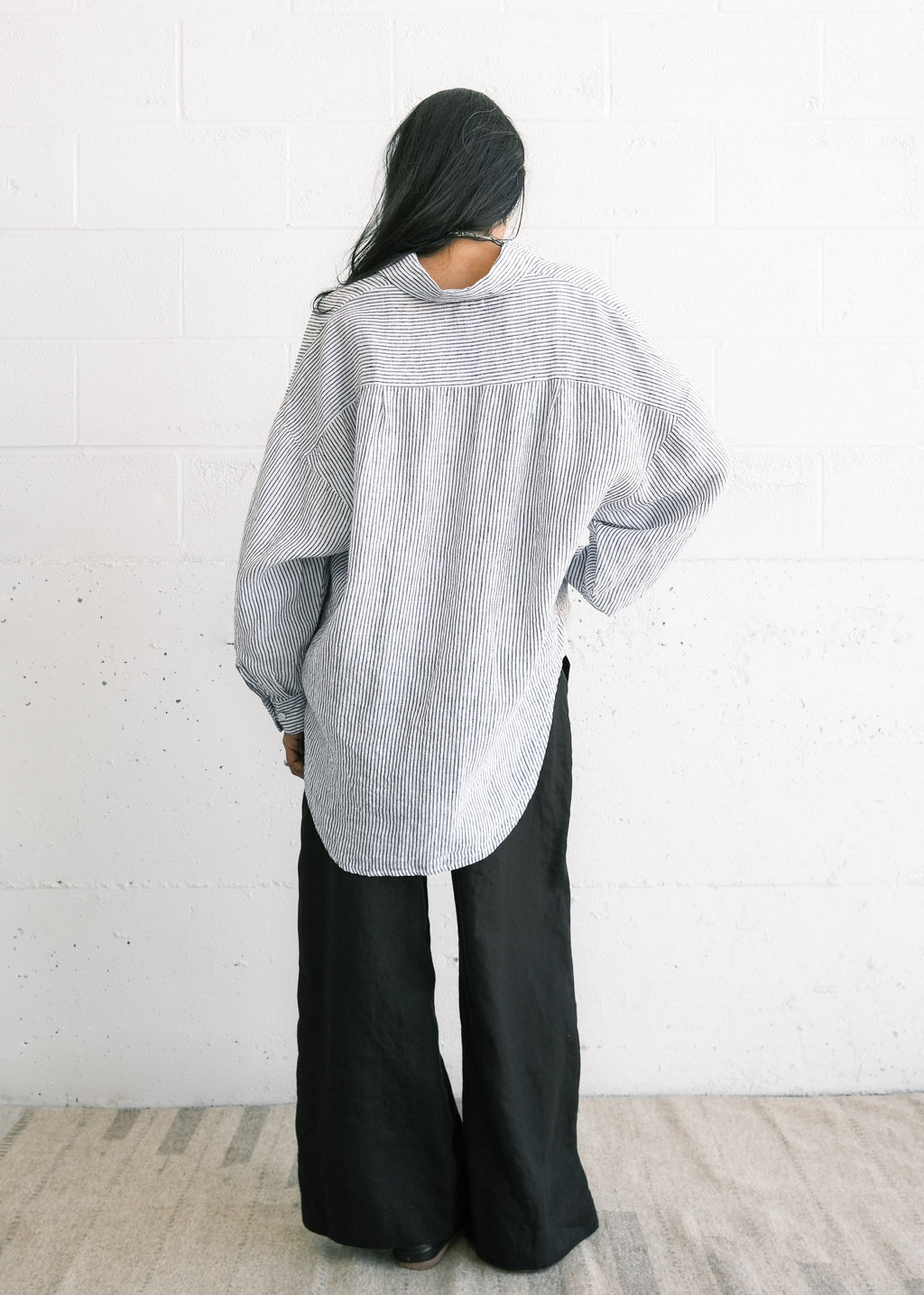 Our take on a classic button up. Beautiful detailing and construction with statement oversized sleeves, classic cuffs, breast pockets, and pleats in the back. Unisex and looks great tucked into high waisted pants. If you like the Shimoga shirt, you will love this top!