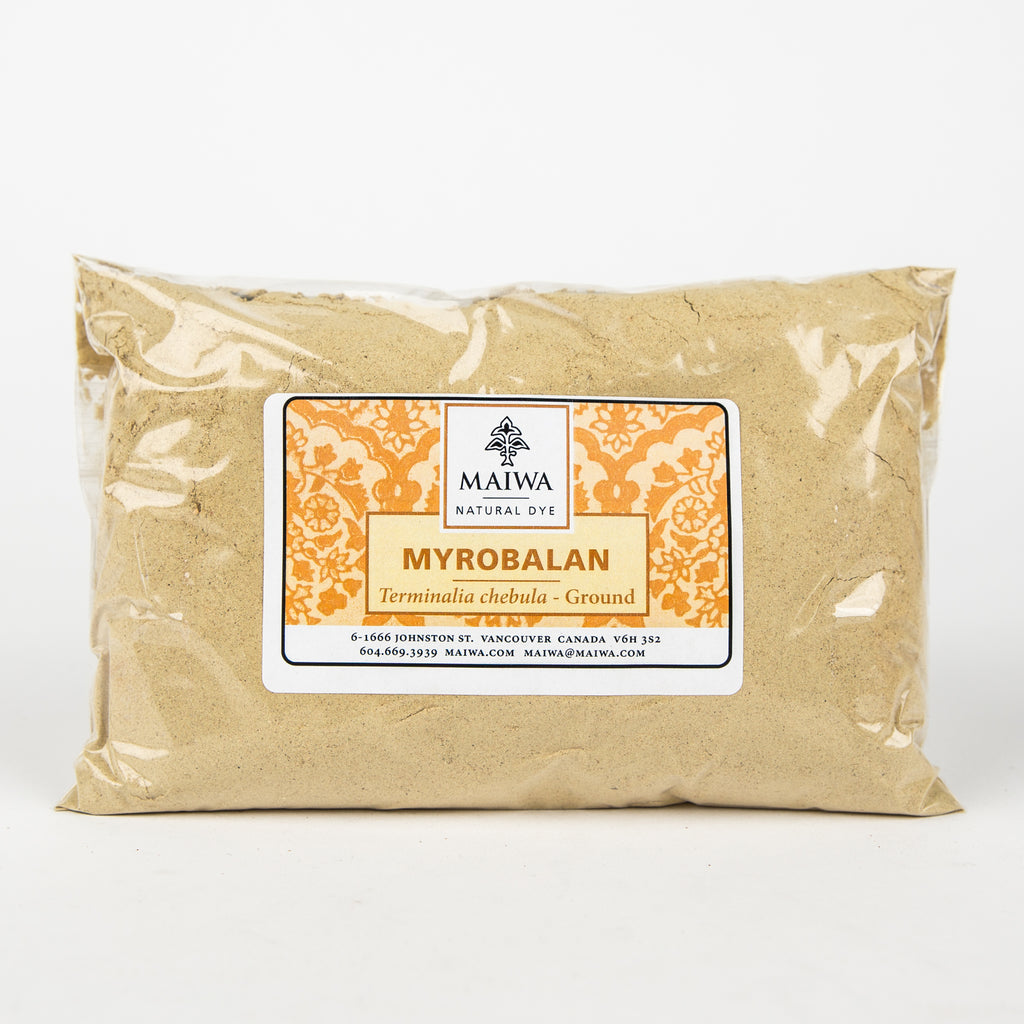 Myrobalan - This dyestuff consists of ground nuts of the Terminalia chebula tree. This tree grows in Nepal, India, Sri Lanka, Burma, Thailand, Indochina and south China. It may be classed as both a mordant and a dye, giving a light buttery yellow when applied. It is an important tannin based mordant for cotton in India and southeast Asia due to the light warm colour it imparts to the cloth. Myrobalan is a good foundation for overdyeing. It is also the perfect colour to lay down under a single indigo dip for teal. When used as a tannin mordant myrobalan requires 15-20% WOF. If using to create a soft butter yellow use 20-30% WOF.