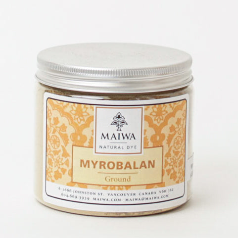 Myrobalan - This dyestuff consists of ground nuts of the Terminalia chebula tree. This tree grows in Nepal, India, Sri Lanka, Burma, Thailand, Indochina and south China. It may be classed as both a mordant and a dye, giving a light buttery yellow when applied. It is an important tannin based mordant for cotton in India and southeast Asia due to the light warm colour it imparts to the cloth. Myrobalan is a good foundation for overdyeing. It is also the perfect colour to lay down under a single indigo dip for teal. When used as a tannin mordant myrobalan requires 15-20% WOF. If using to create a soft butter yellow use 20-30% WOF.