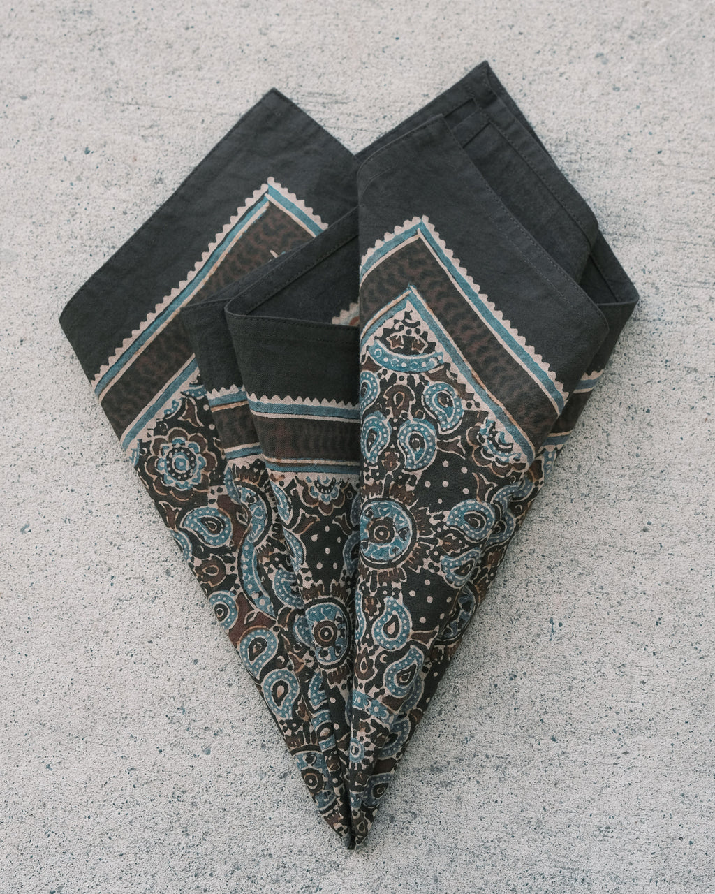 Ajrakh is a traditional style of block printing which uses hand-carved wooden blocks to print natural dyes on organic cotton. These Ajrakhs are made by a family that has been block printing for over nine generations - the Khatri family residing in the Kachchh desert of Gujarat, India.