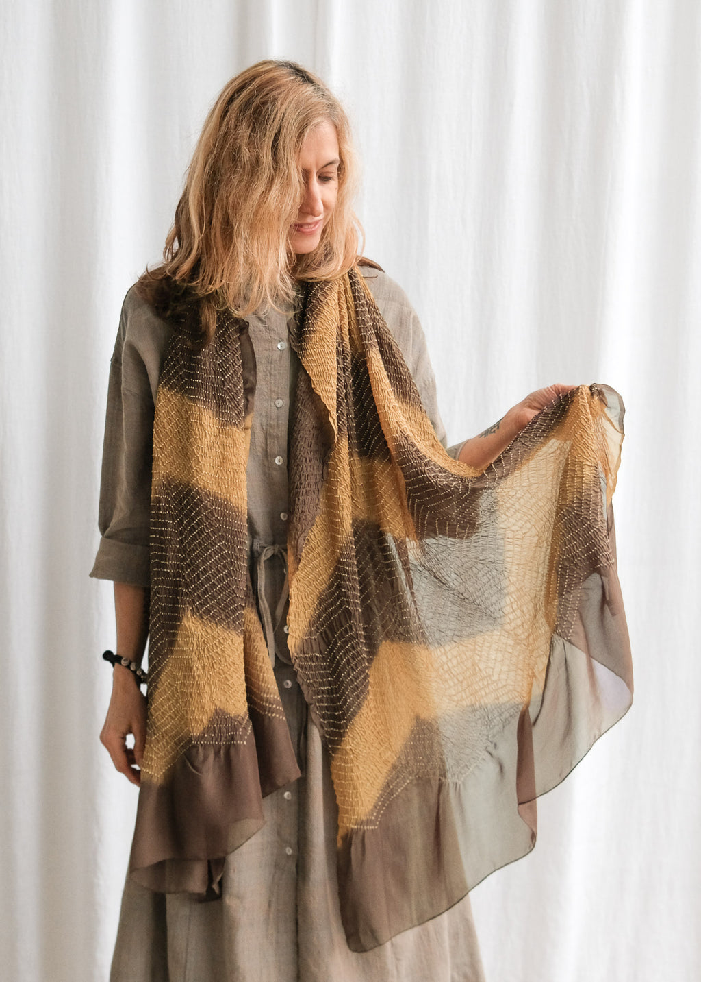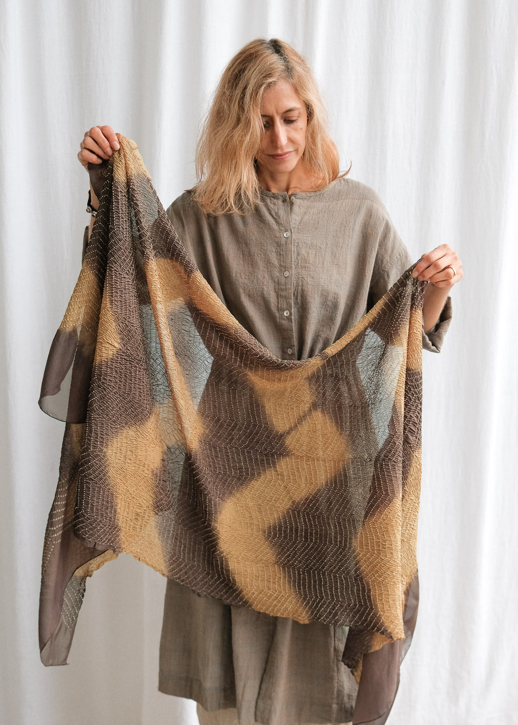 To achieve multiple colours with this process requires skill and patience as each new colour needs either a new tie or a separate dip in the dyebath. The result of applying bandhani on silk is a sculptural textile with a unique life of its own.