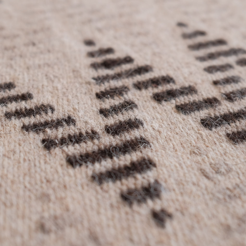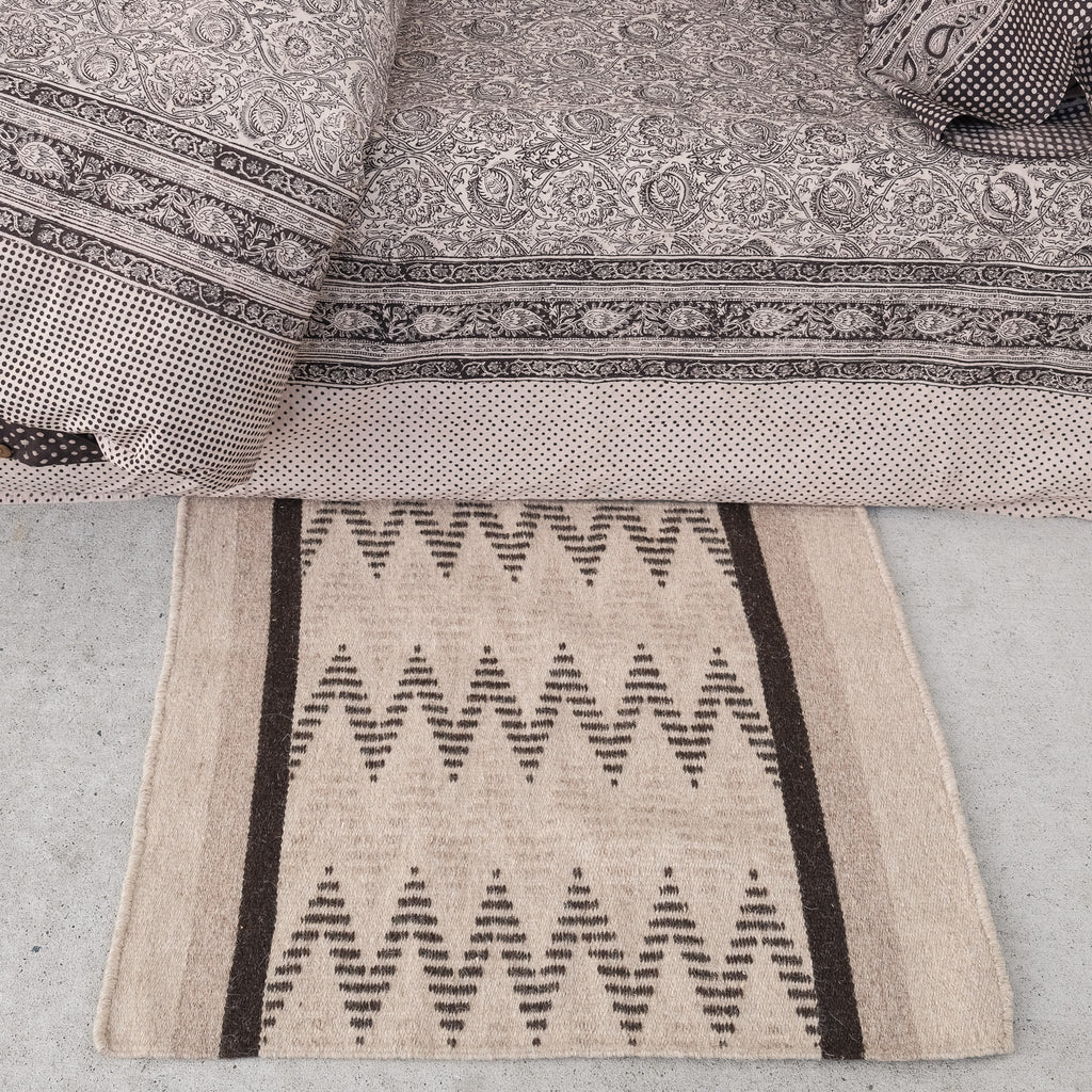 A handwoven wool carpet with a sturdy cotton warp made by village artisans in Rajasthan, India. The natural fibres of the local sheep in the desert regions of Rajasthan makes these flat-weave rugs long lasting and durable.