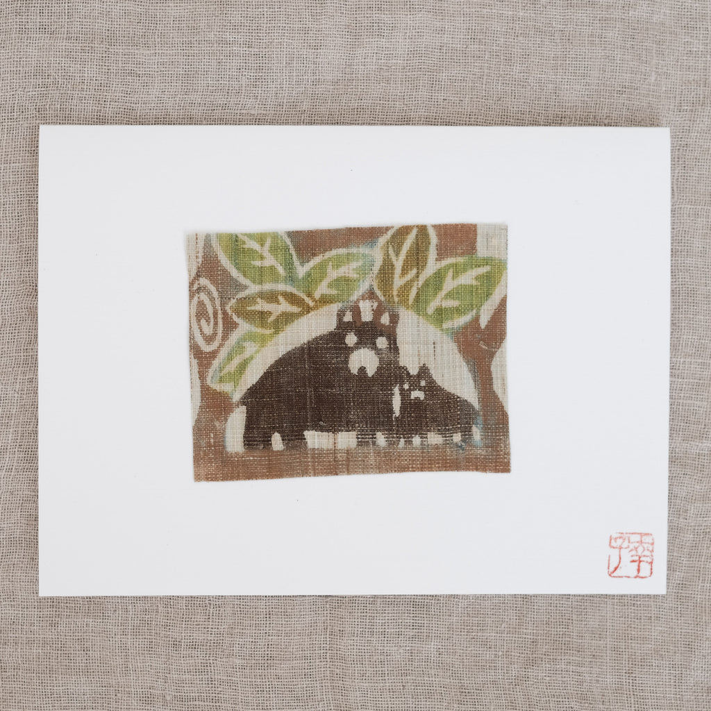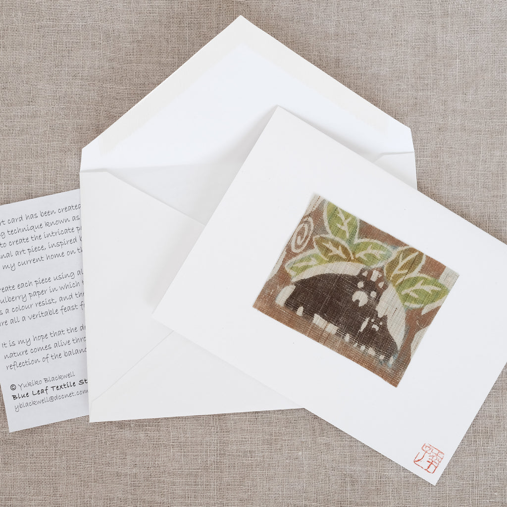 This art card has been created using a centuries-old Japanese stencil dyeing technique known as 'Katazome'. This practice has been traditionally used to create the intricate patterns found on kimonos. Each design is an original art piece, inspired by the flora and fauna of both Yuki's native Japan, and her current home on the Sunshine Coast of British Columbia, Canada.