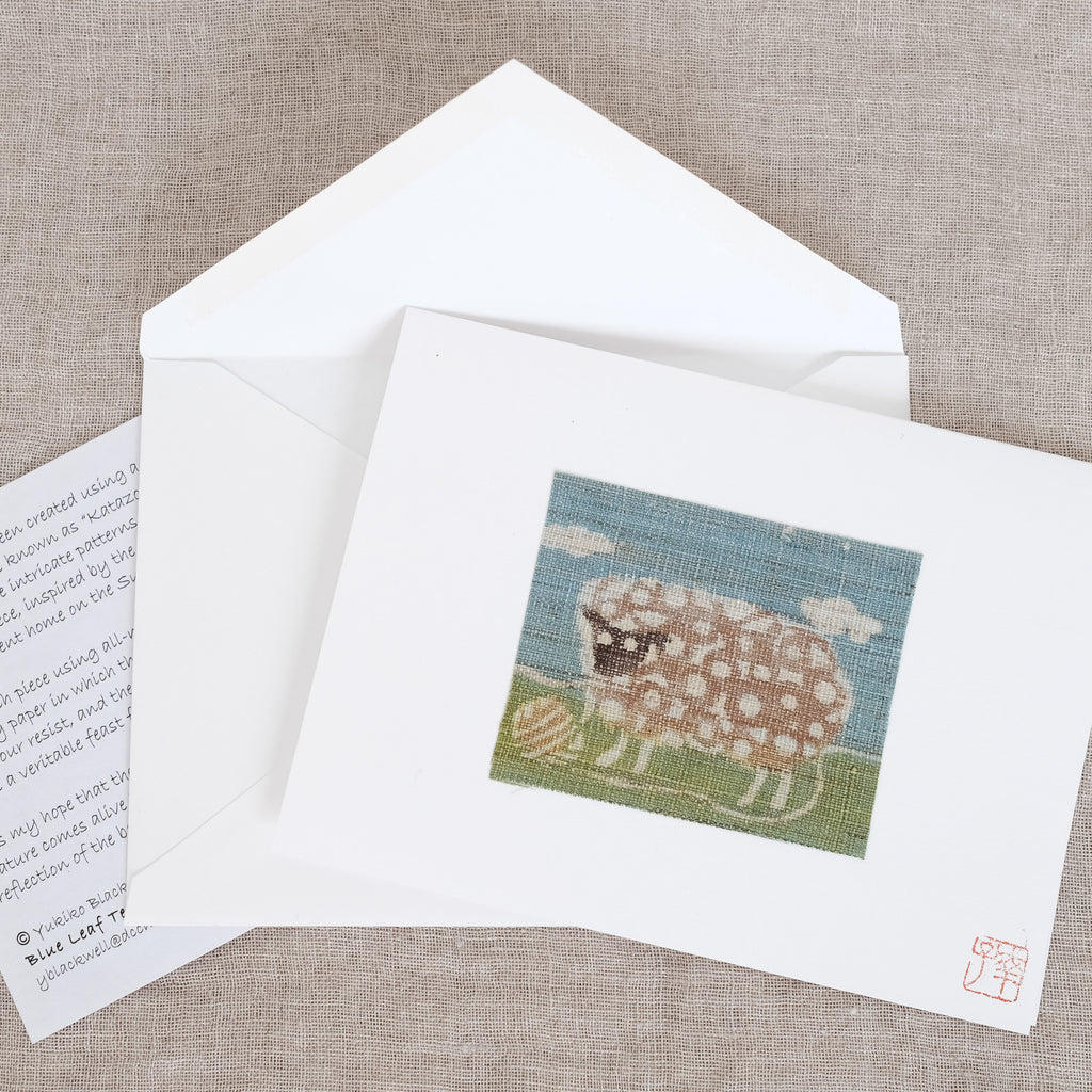 This art card has been created using a centuries-old Japanese stencil dyeing technique known as 'Katazome'. This practice has been traditionally used to create the intricate patterns found on kimonos. Each design is an original art piece, inspired by the flora and fauna of both Yuki's native Japan, and her current home on the Sunshine Coast of British Columbia, Canada.