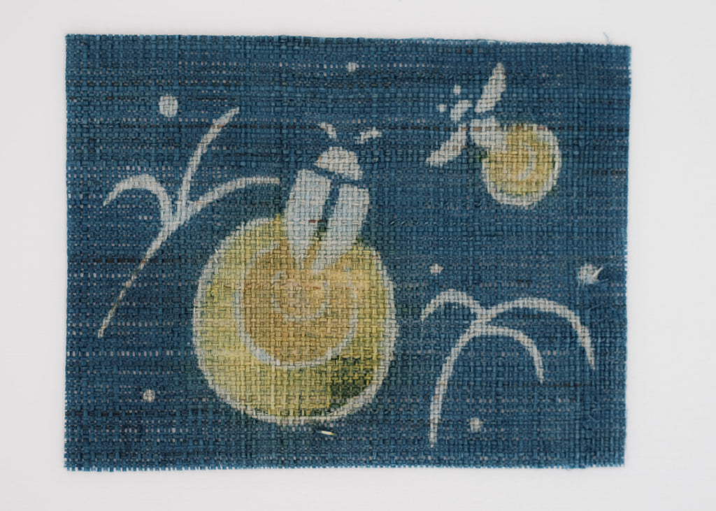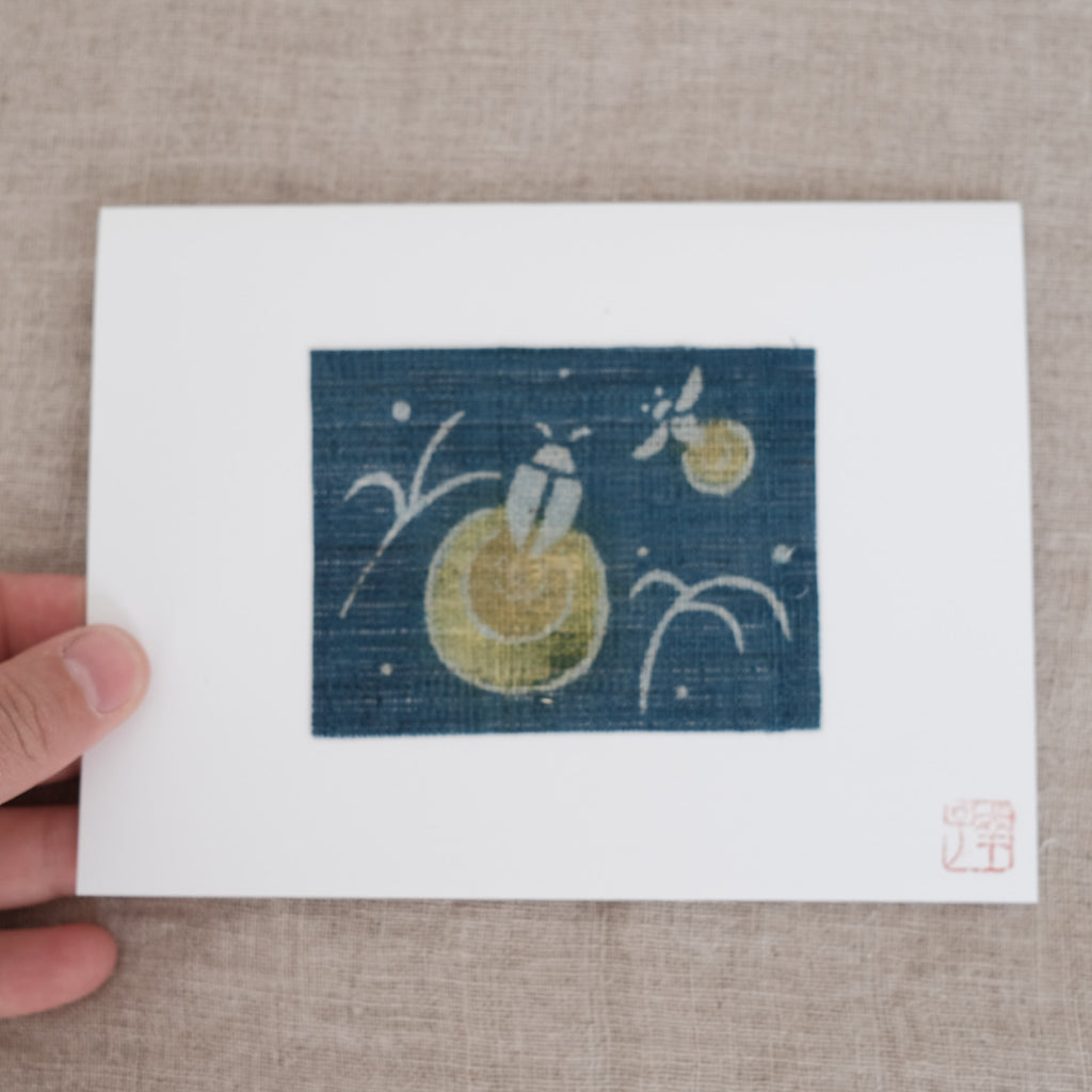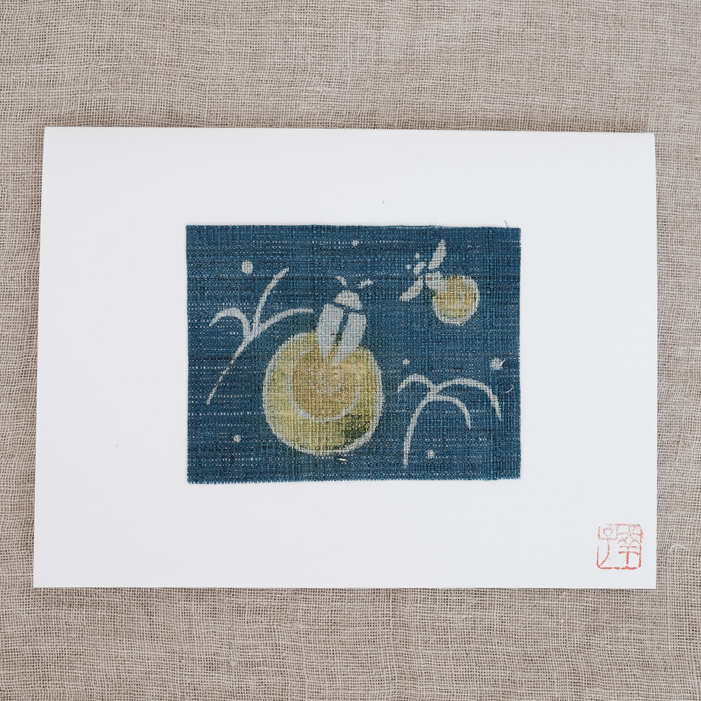 Each card is created using all natural materials.  The fragrant smoked mulberry paper in which the stencils are carved, the rice bran paste used as a colour resist, and the natural dyes applied onto the handwoven linen are all veritable feasts for the senses.