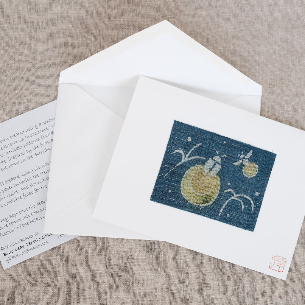 This art card has been created using a centuries-old Japanese stencil dyeing technique known as 'Katazome'. This practice has been traditionally used to create the intricate patterns found on kimonos. Each design is an original art piece, inspired by the flora and fauna of both Yuki's native Japan, and her current home on the Sunshine Coast of British Columbia, Canada.
