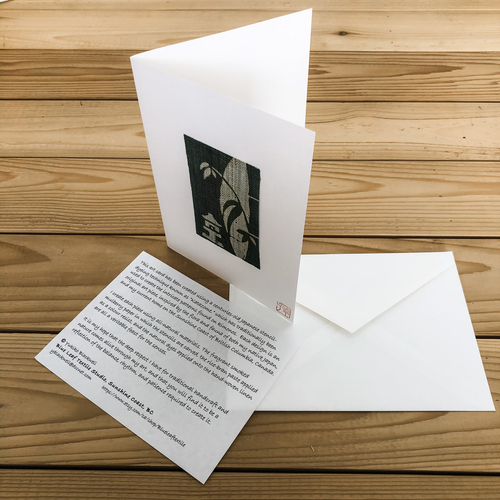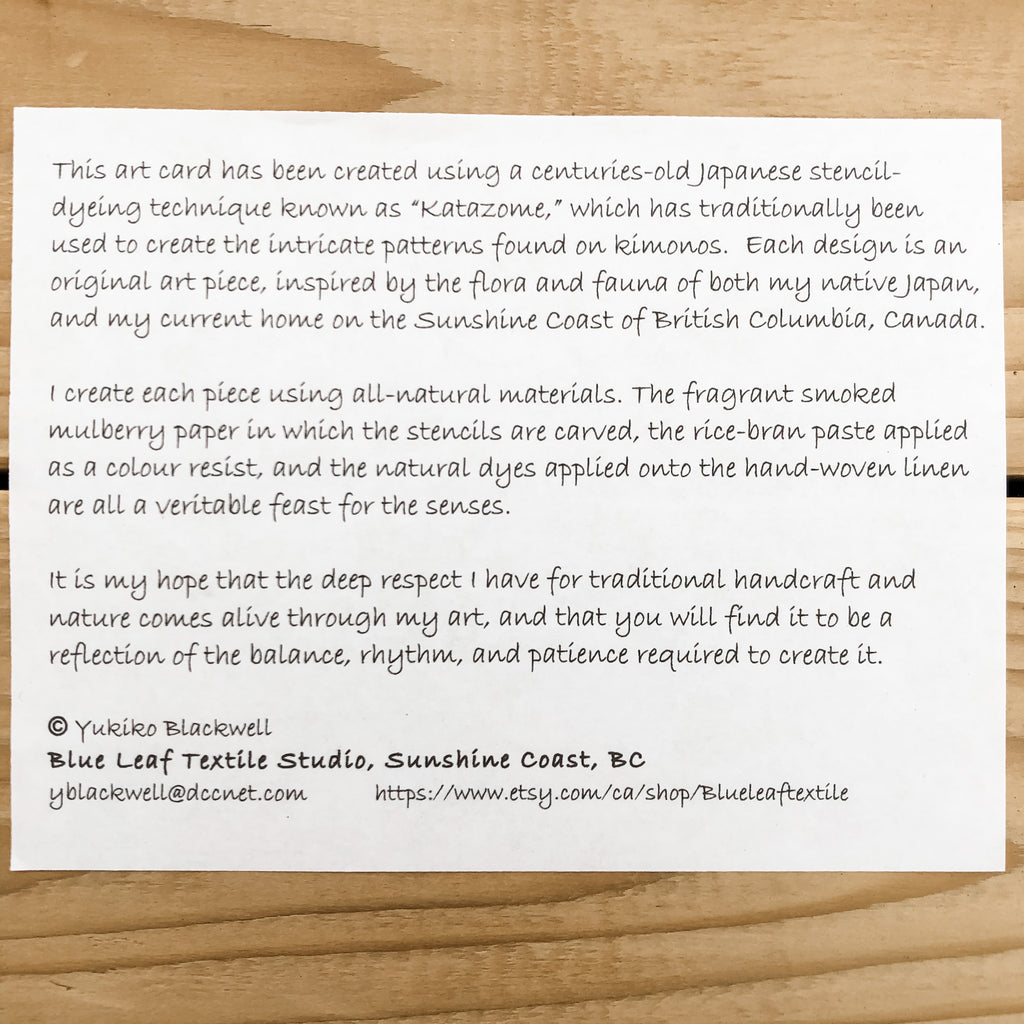 This art card has been created using a centuries-old Japanese stencil-dyeing technique known as 'Katazome' which has traditionally been used to create the intricate patterns found on kimonos.  Each design is an original art piece, inspired by the flora and fauna of both Yuki's native Japan, and her current home on the Sunshine Coast of British Columbia, Canada.
