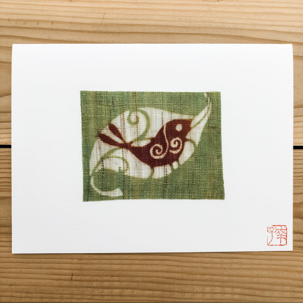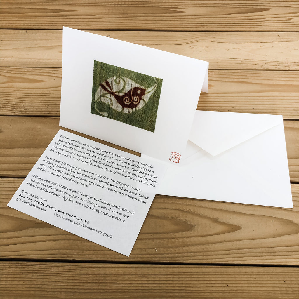 This art card has been created using a centuries-old Japanese stencil-dyeing technique known as 'Katazome' which has traditionally been used to create the intricate patterns found on kimonos.  Each design is an original art piece, inspired by the flora and fauna of both Yuki's native Japan, and her current home on the Sunshine Coast of British Columbia, Canada.