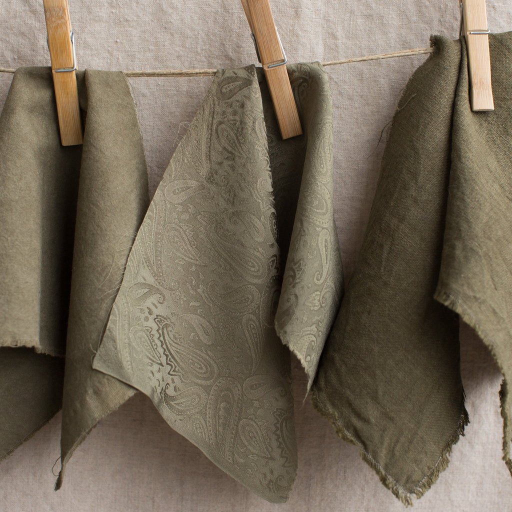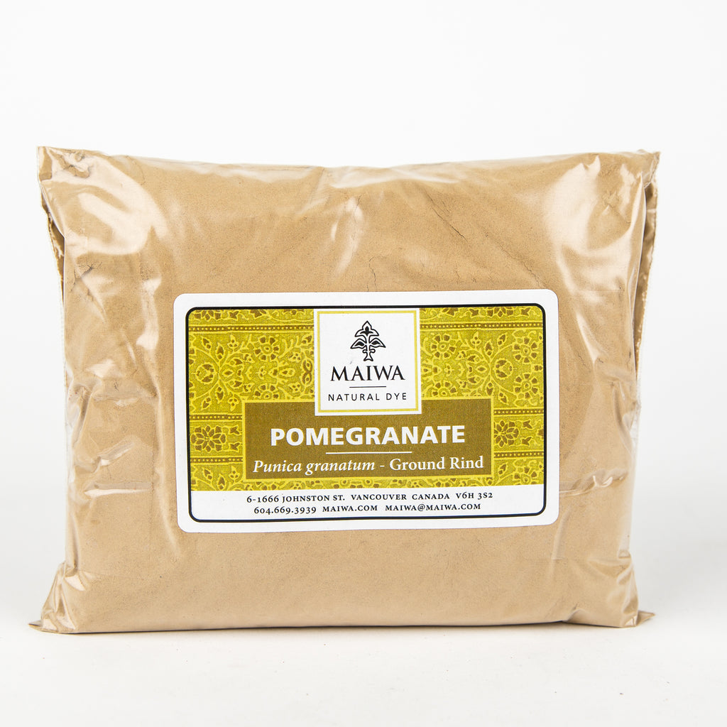 Pomegranate - An extract or a powder from the rinds of pomegranates Punica granatum, this dyestuff is high in tannin and improves the light and washfastness of any dye with which it is mixed. In India and south east Asia it is used as both a dye and a mordant. Pomegranate yields soft yellows to green-yellows when used at 5-8%  WOF for the extract (15 - 20% WOF for the powder) for a medium depth of shade. When combined with iron, pomegranate yields yummy warm cement greys and deep moss greens. It is often mixed with the more fugitive turmeric dye to brighten the yellow and make it lightfast.