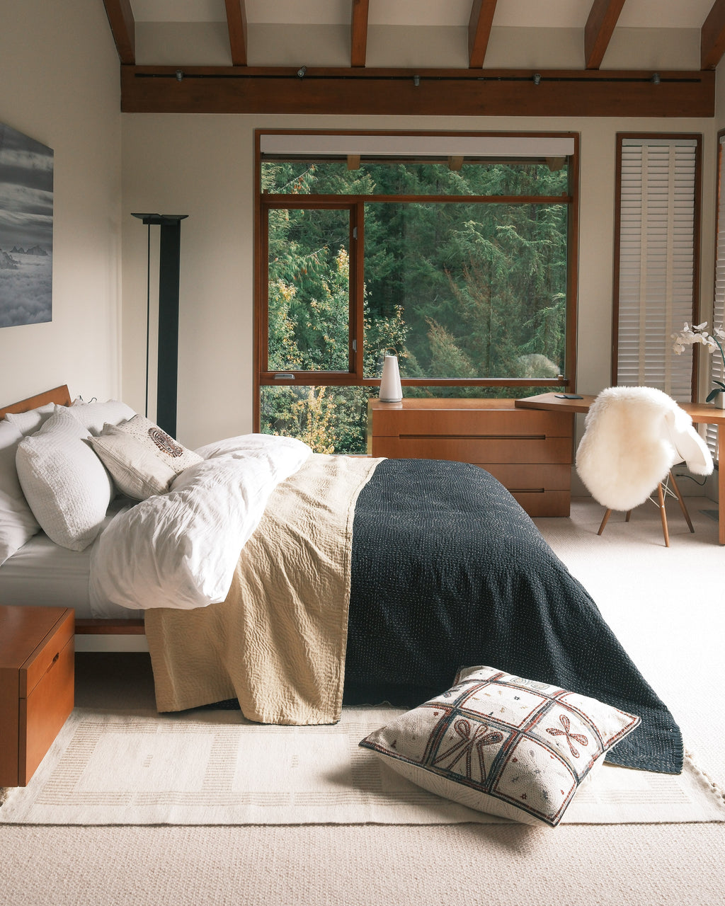 These stunning black & white handstitched cotton quilts are a contemporary show of artisanal hand-work. Created by village artisans in India in partnership with Maiwa.
