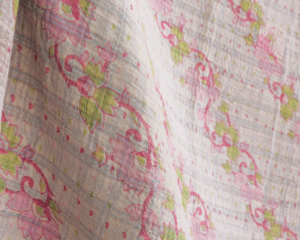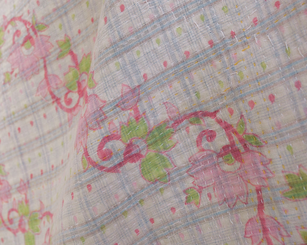 Kantha quilts are made for household use in rural parts of Bengal and Bangladesh. Favourite prints, saris, and beloved lengths of cloth are stitched together with plain and coloured threads. Every quilter has her own individual style. These quilts are used as bedcovers, blankets, tablecloths, picnic blankets, car blankets, couch blankets ... there is no limit to the utility of these textiles. We love the history and stories each one holds.