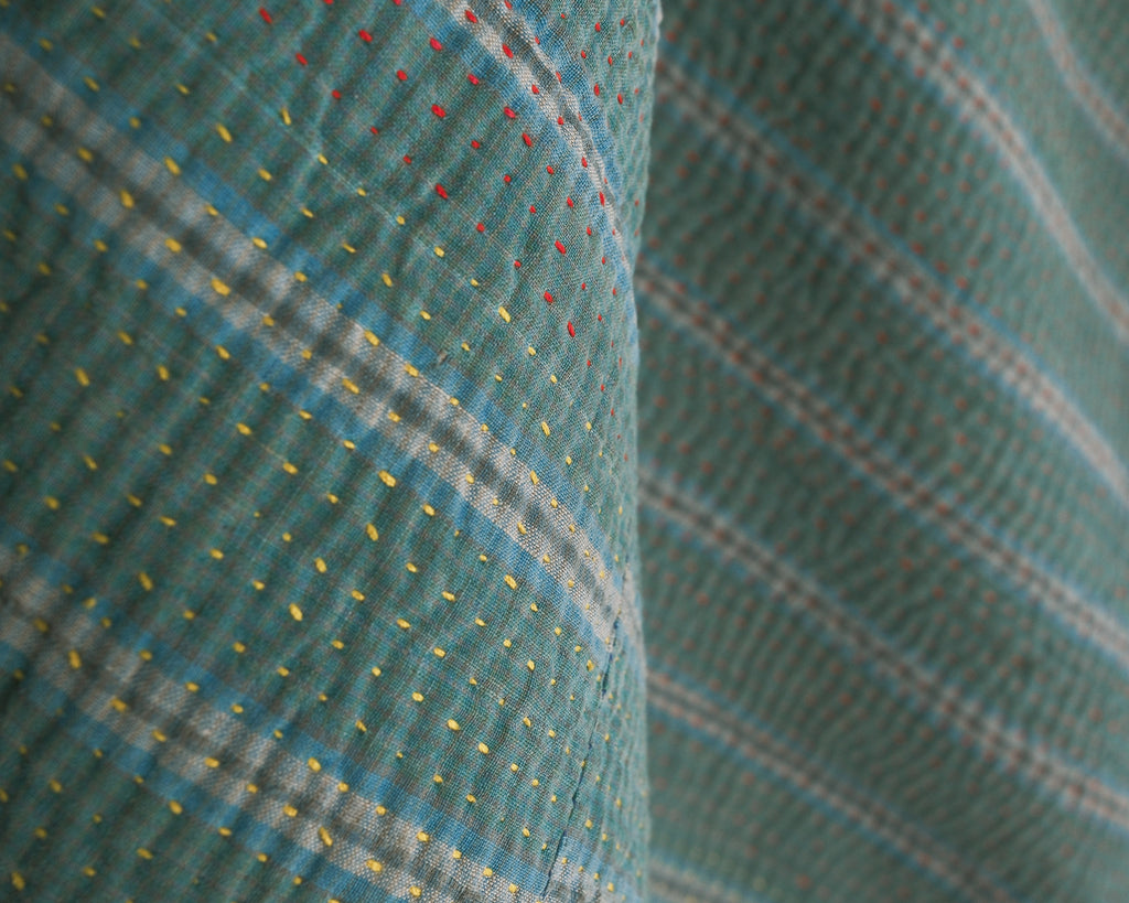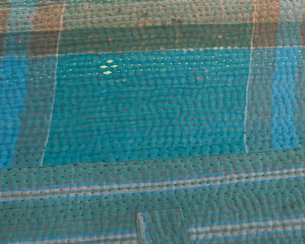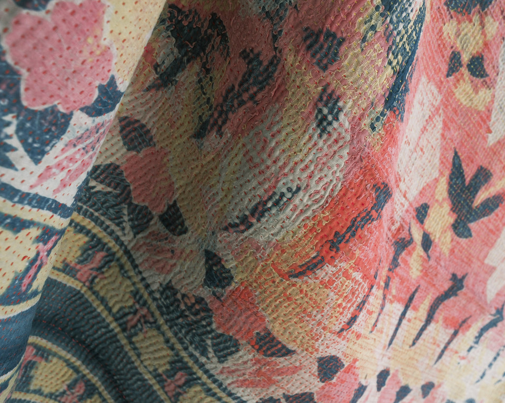 Kantha quilts are made for household use in rural parts of Bengal and Bangladesh. Favourite prints, saris, and beloved lengths of cloth are stitched together with plain and coloured threads. Every quilter has her own individual style. These quilts are used as bedcovers, blankets, tablecloths, picnic blankets, car blankets, couch blankets ... there is no limit to the utility of these textiles. We love the history and stories each one holds.