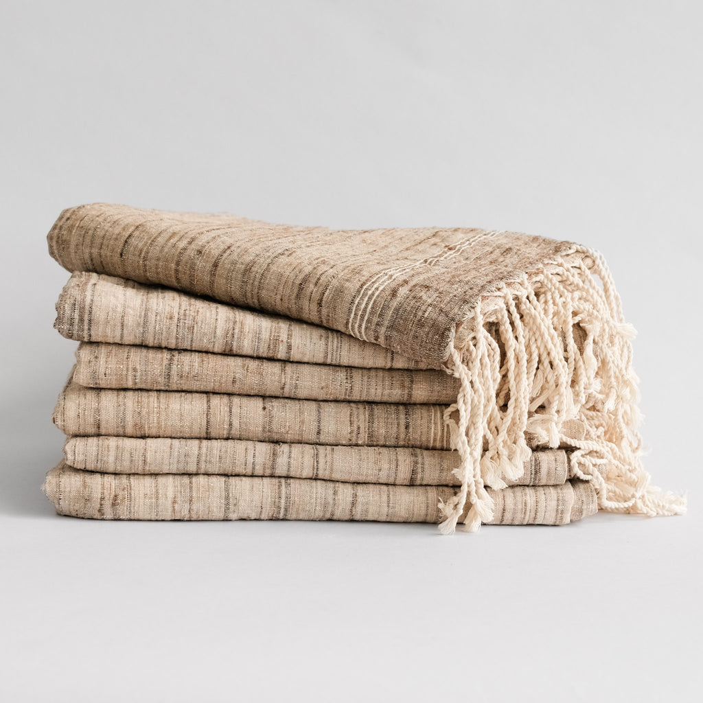 Pack of 6. These handwoven scarves are made with a wild silk weft and matka silk warp, giving them a soft glow and a lovely warmth. Finished with twisted tassels along the edge, these pieces are beautiful as is and also take dye very well. We love using natural dyes on these.