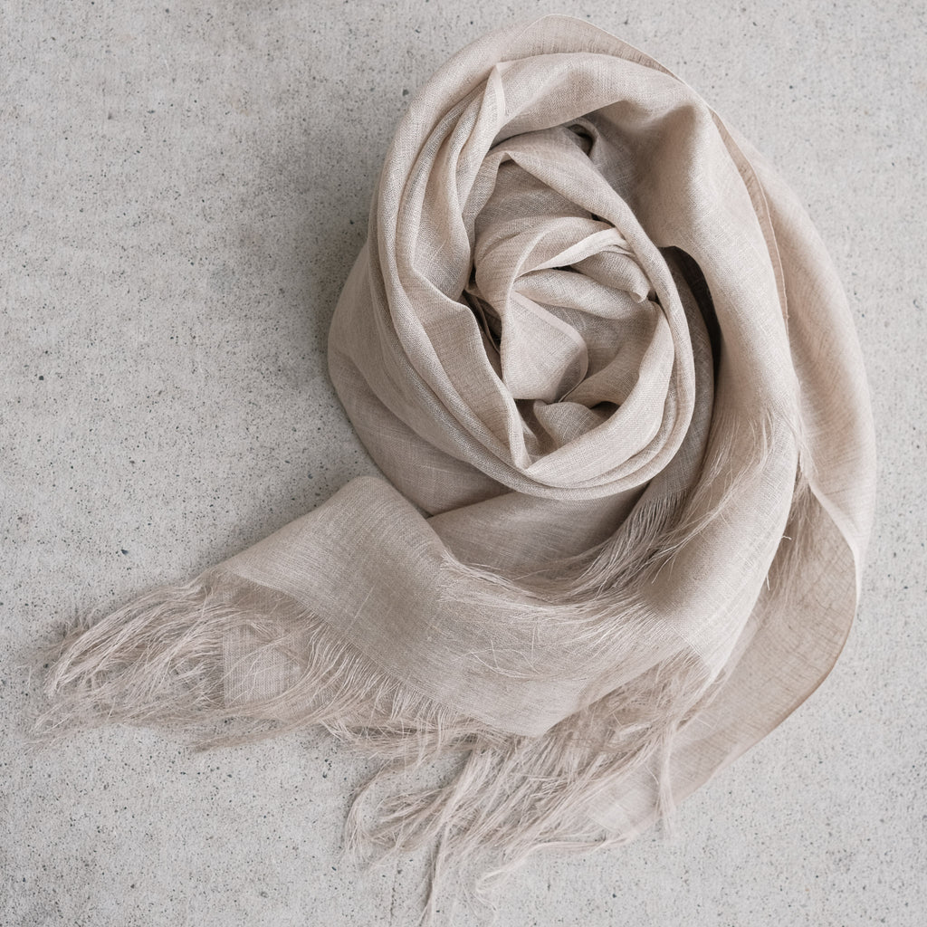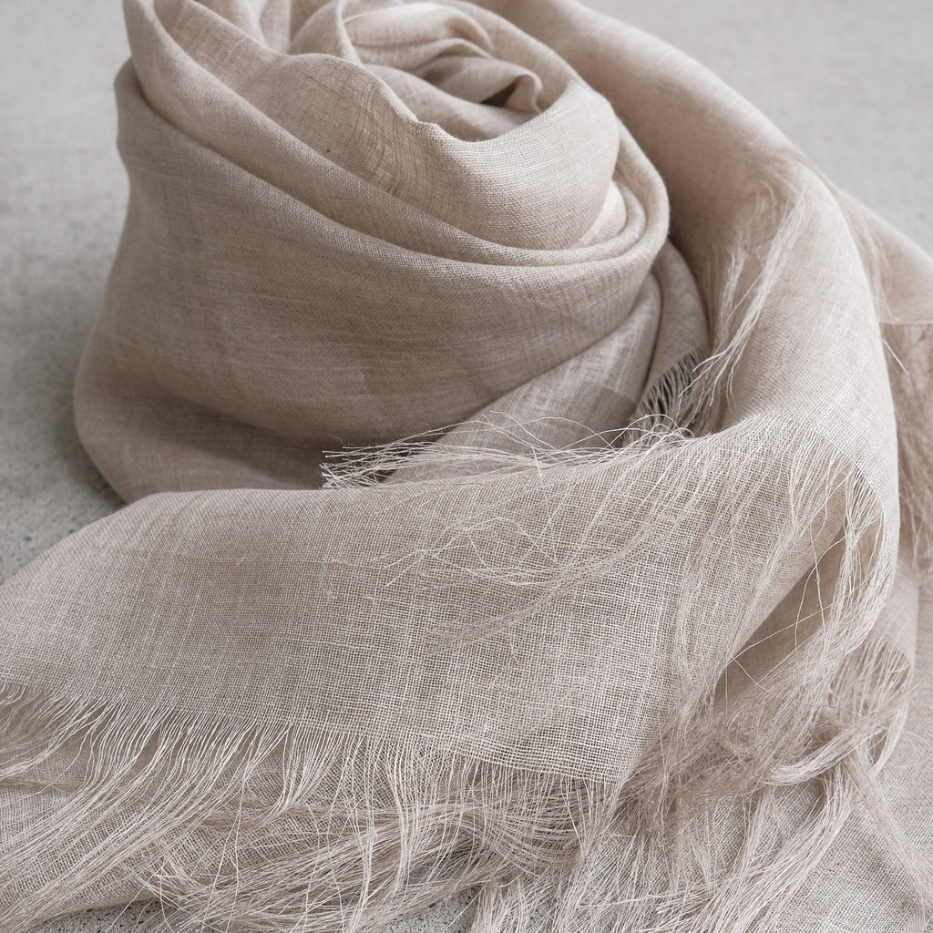 A superfine handwoven linen shawl with a raw fringe. It is lightweight with a lovely drape and is perfect for a creative project such as dyeing, shibori, and itajime.