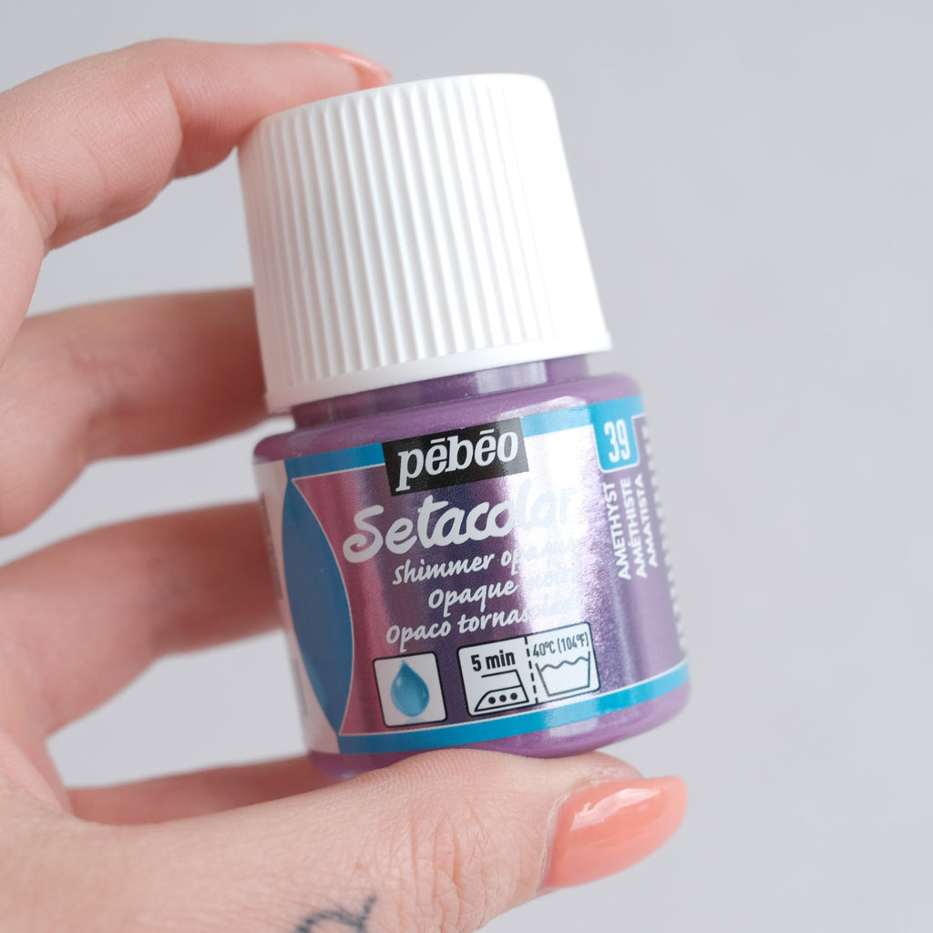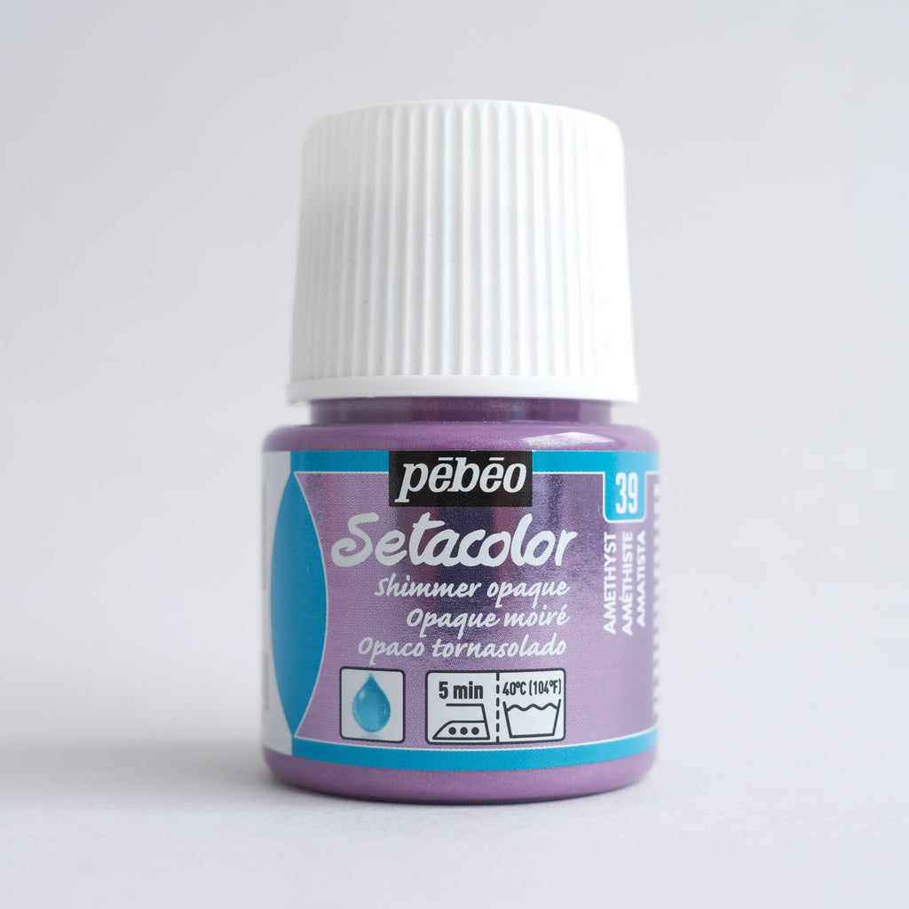 These beautiful, professional fabric paints from France can be used on most fabrics, including blends with synthetics. To render them washfast simply iron for 1-2 minutes front and back. The color range of this product is exquisite – the iridescent and opaques work well on both white and dark fabrics and the transparents are wonderful for blending, doing watercolor techniques, airbrushing etc. These fabric paints have excellent washfastness and lightfastness and leave the fabric with a very soft hand.
