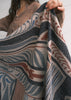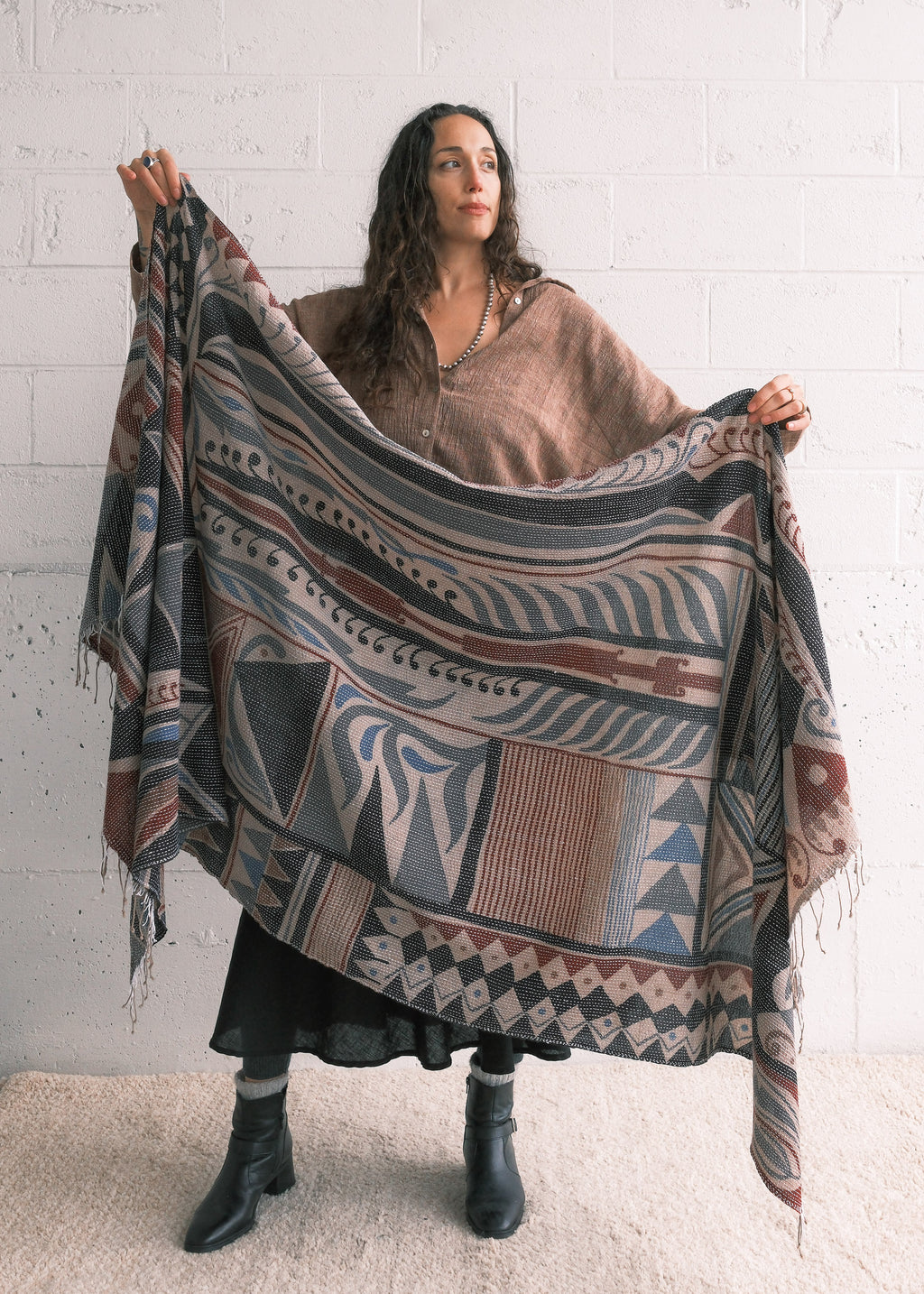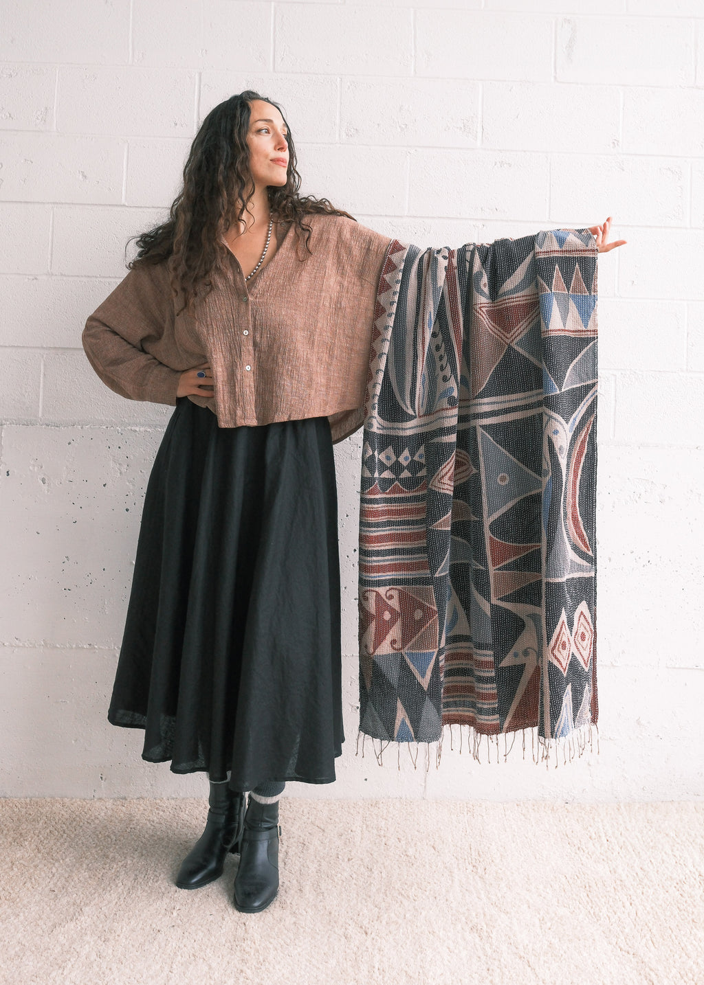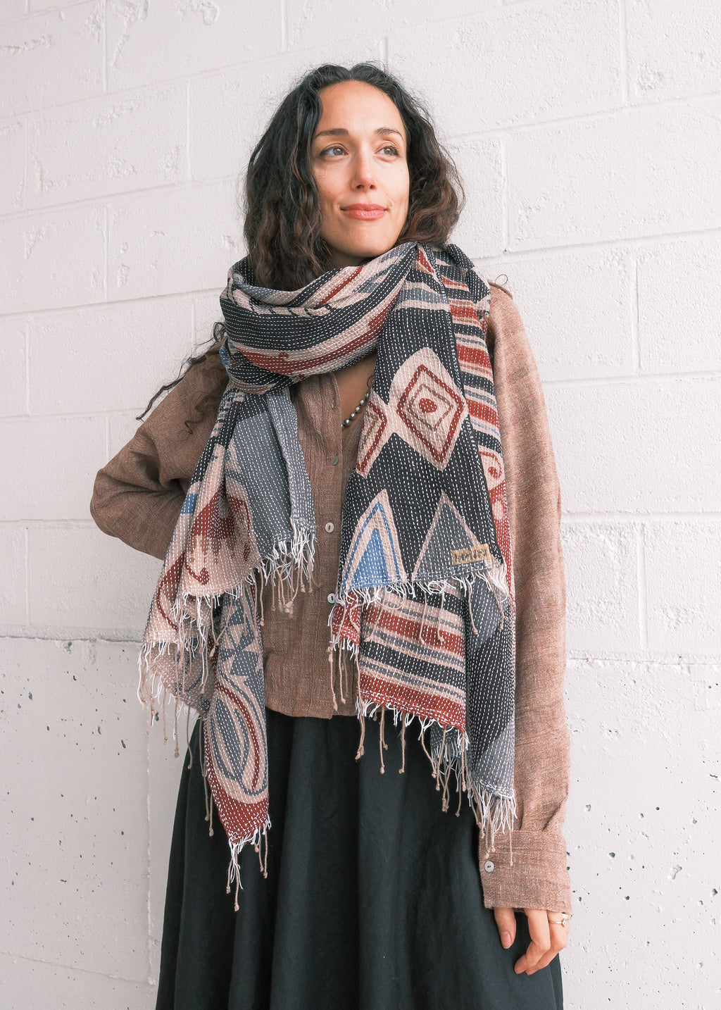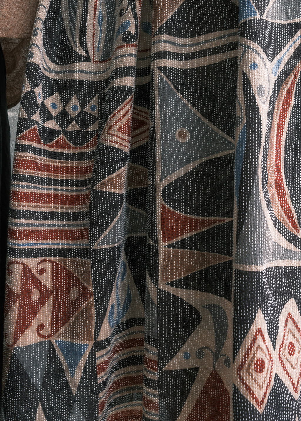 This shawl is a lightweight cotton handwoven in Bengal, India and hand-painted with natural dyes using the ancient technique of Kalamkari.  The final step is kantha stitching - running stitches done by hand to give the piece added depth and character. It can be styled as a scarf, hung on a wall as a piece of art, or draped across a table as a runner.
