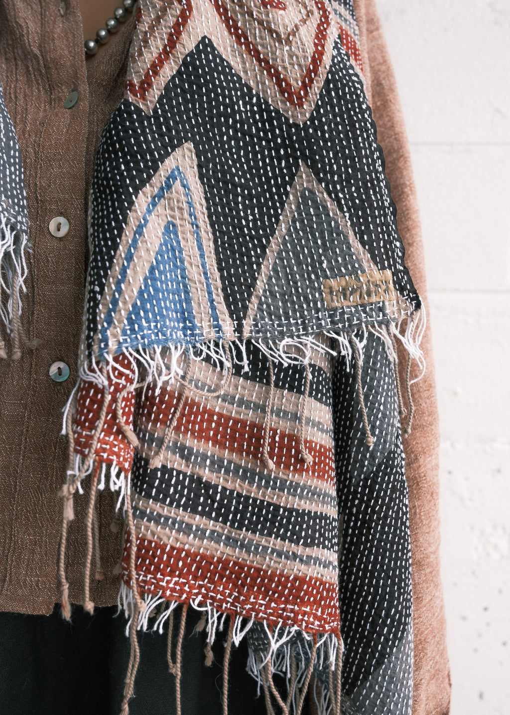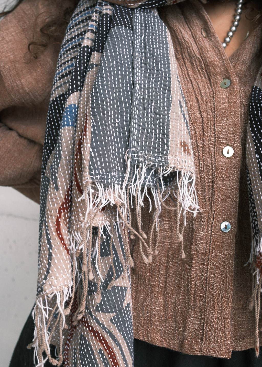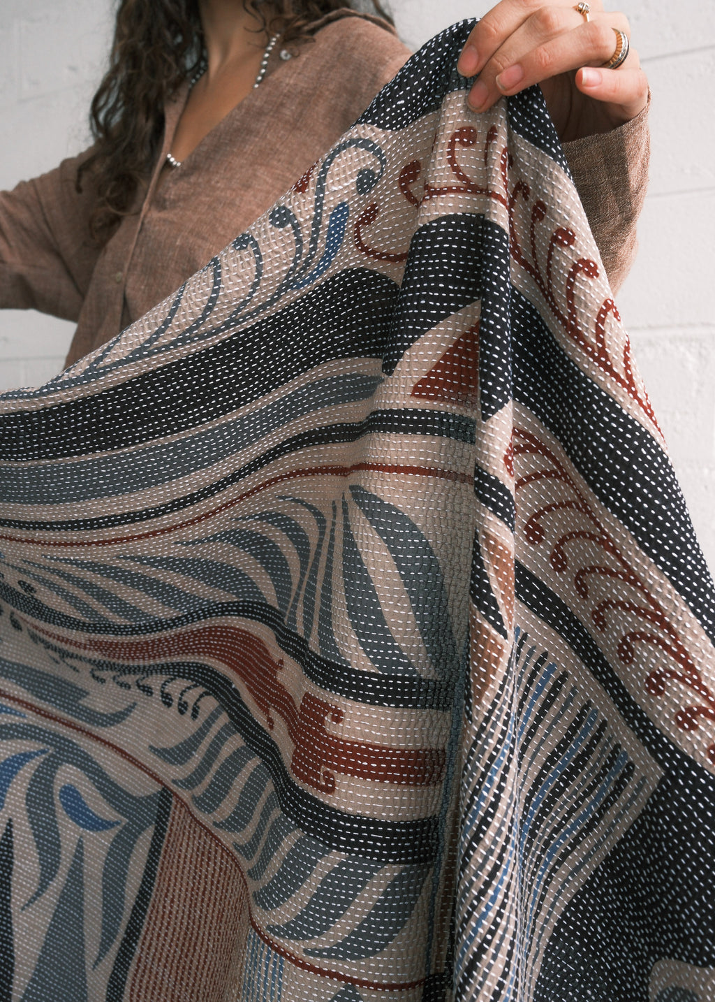 Haridra Hand Painted Cotton Shawl - Kantha Stitched - Pacific Sands