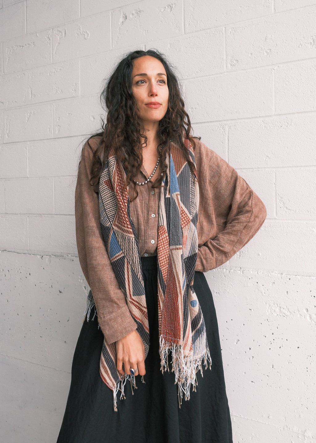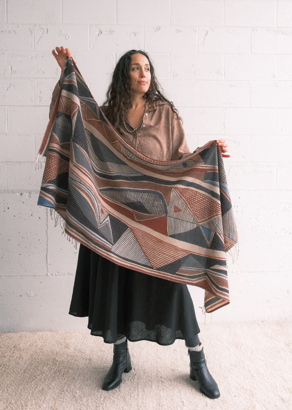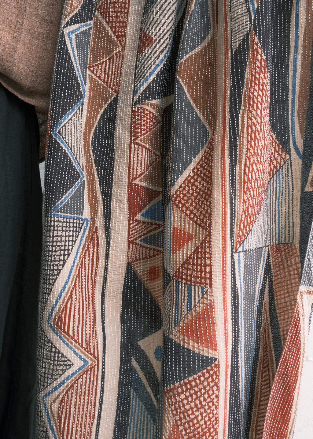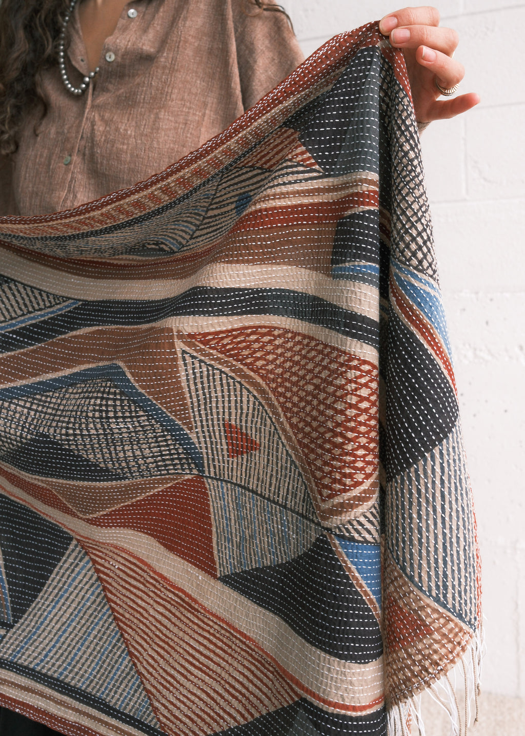 This shawl is a lightweight cotton handwoven in Bengal, India and hand-painted with natural dyes using the ancient technique of Kalamkari.  The final step is kantha stitching - running stitches done by hand to give the piece added depth and character. It can be styled as a scarf, hung on a wall as a piece of art, or draped across a table as a runner.