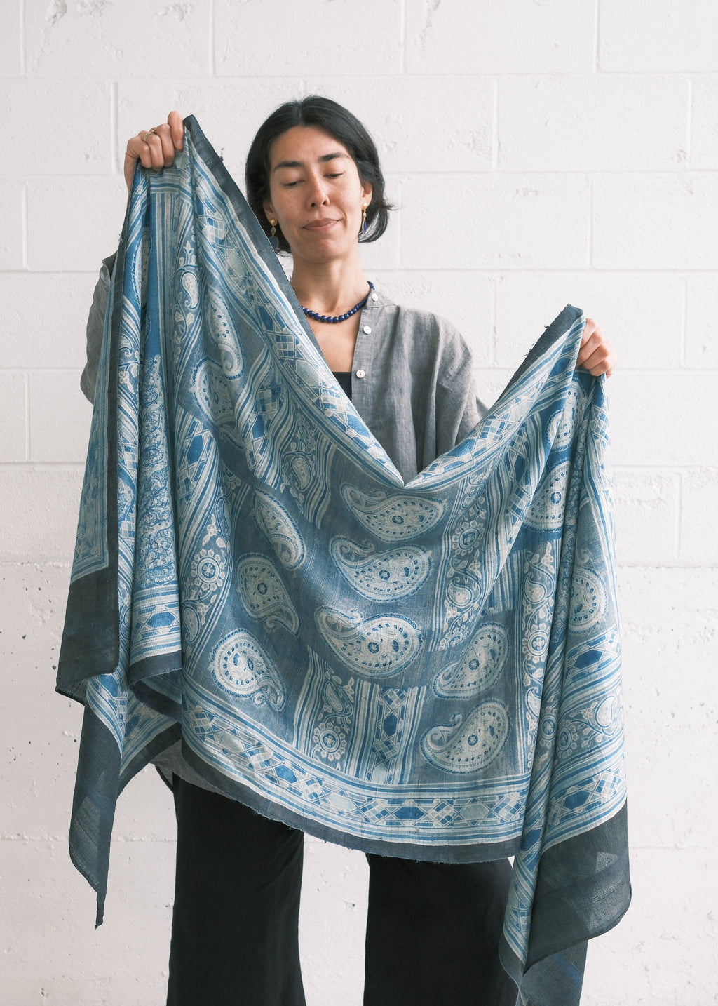 Mumbai Block Print Shawl - Handwoven Silk - Ocean Tiles