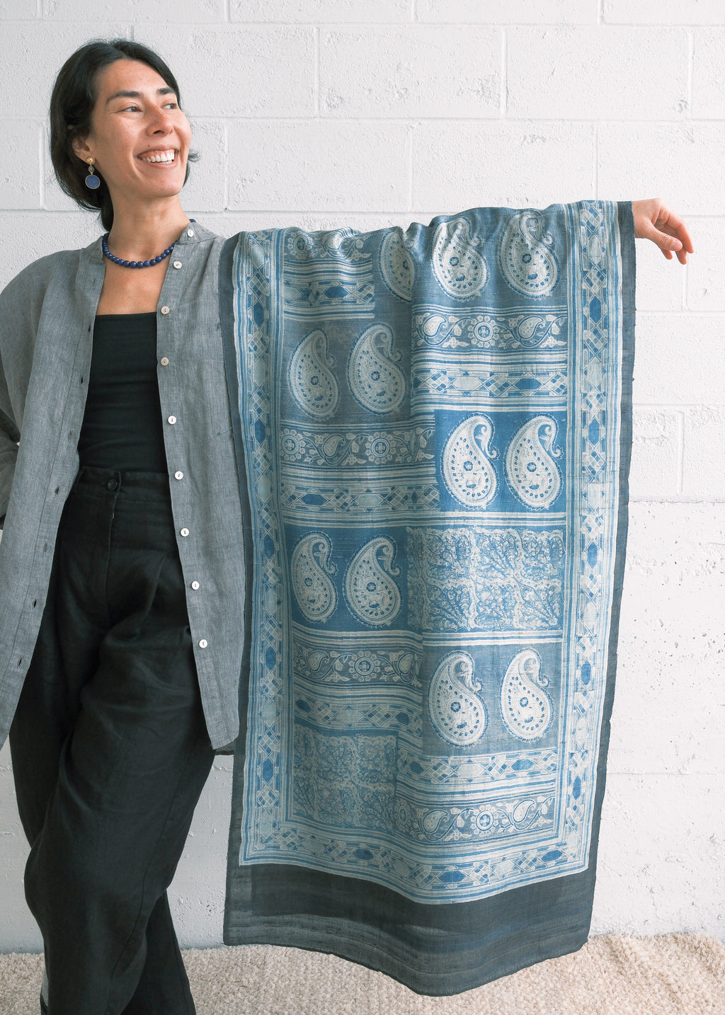 This piece features contemporary wood blocks specially cut to imitate distressed painterly techniques, combined with the more familiar play of repeat geometric forms. The handwoven cloth, in combination with natural dyes, glows with an incredible vibrancy and has elegant drape.