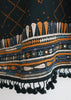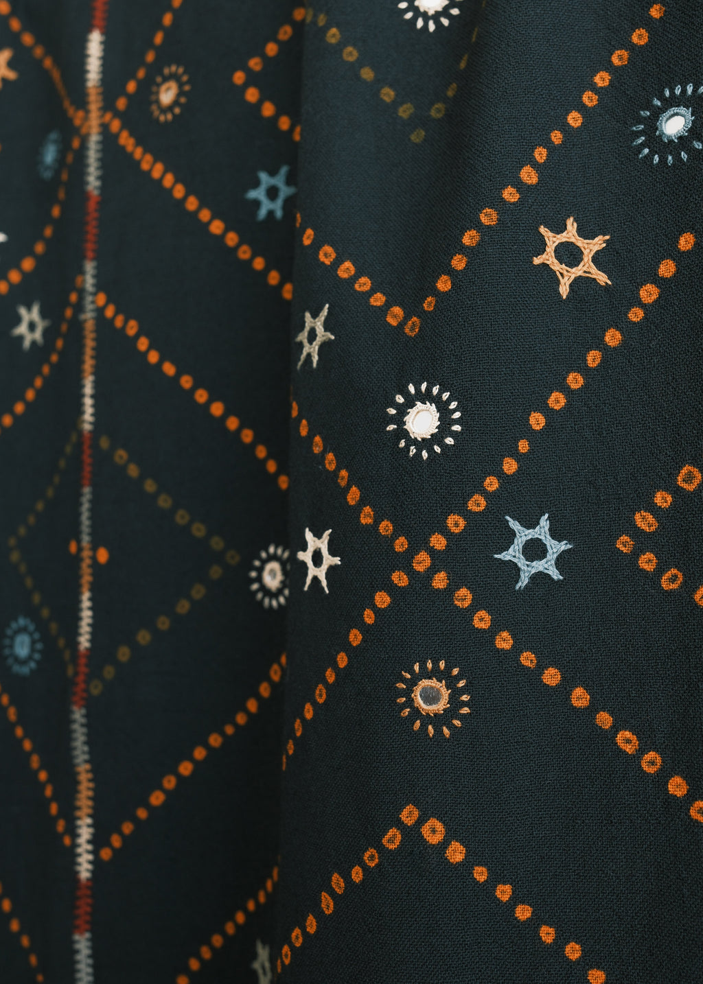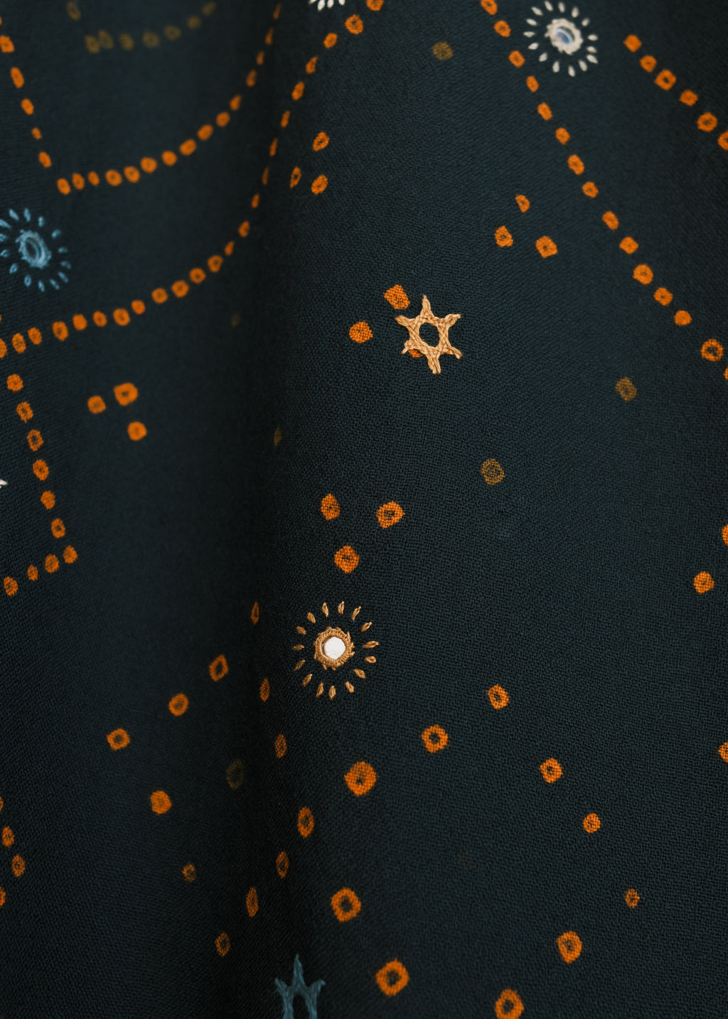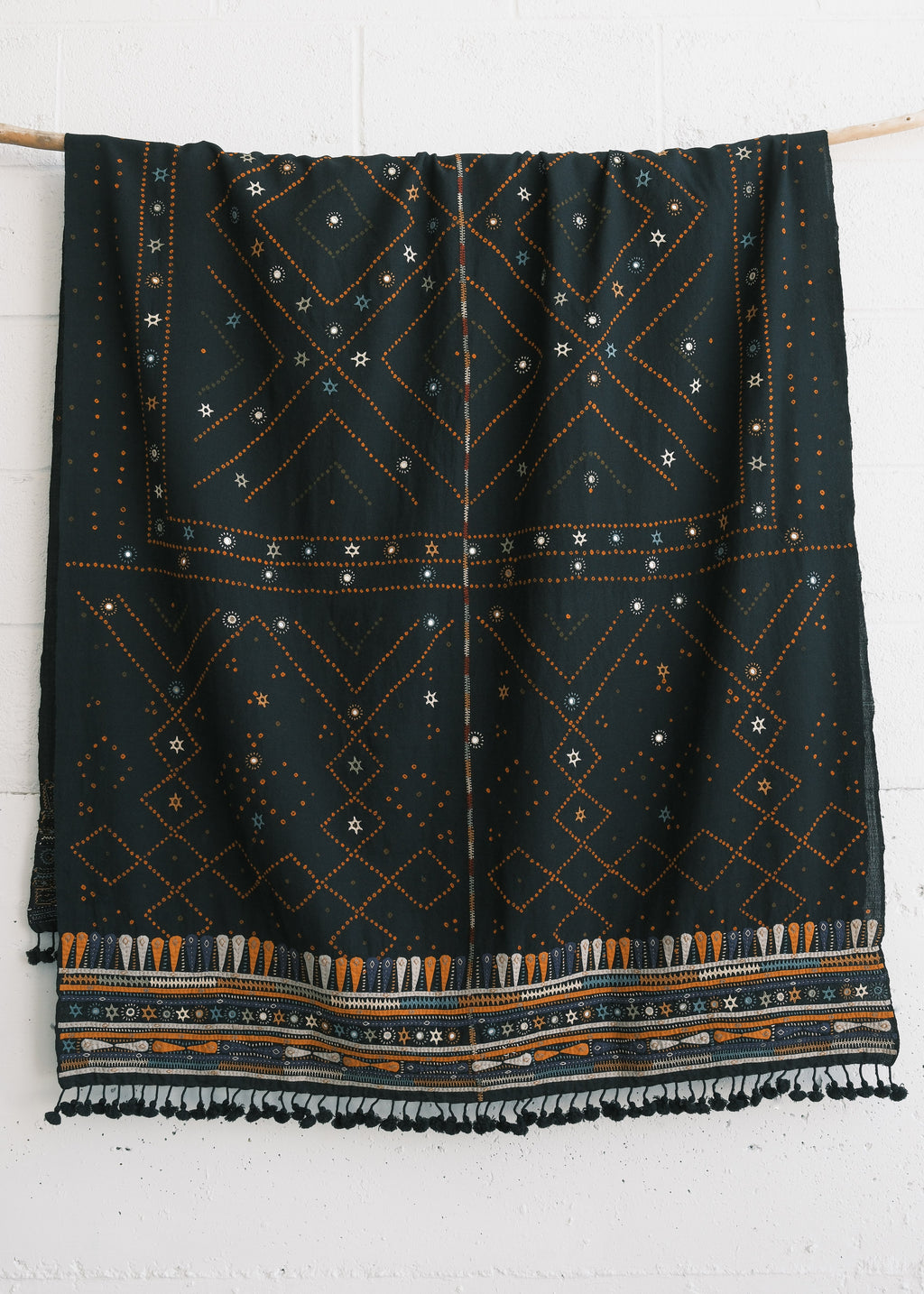 Process:  Handwoven wool, bandhani tied (shibori) and dyed, and hand embroidered by village artisans in Kachchh, India.