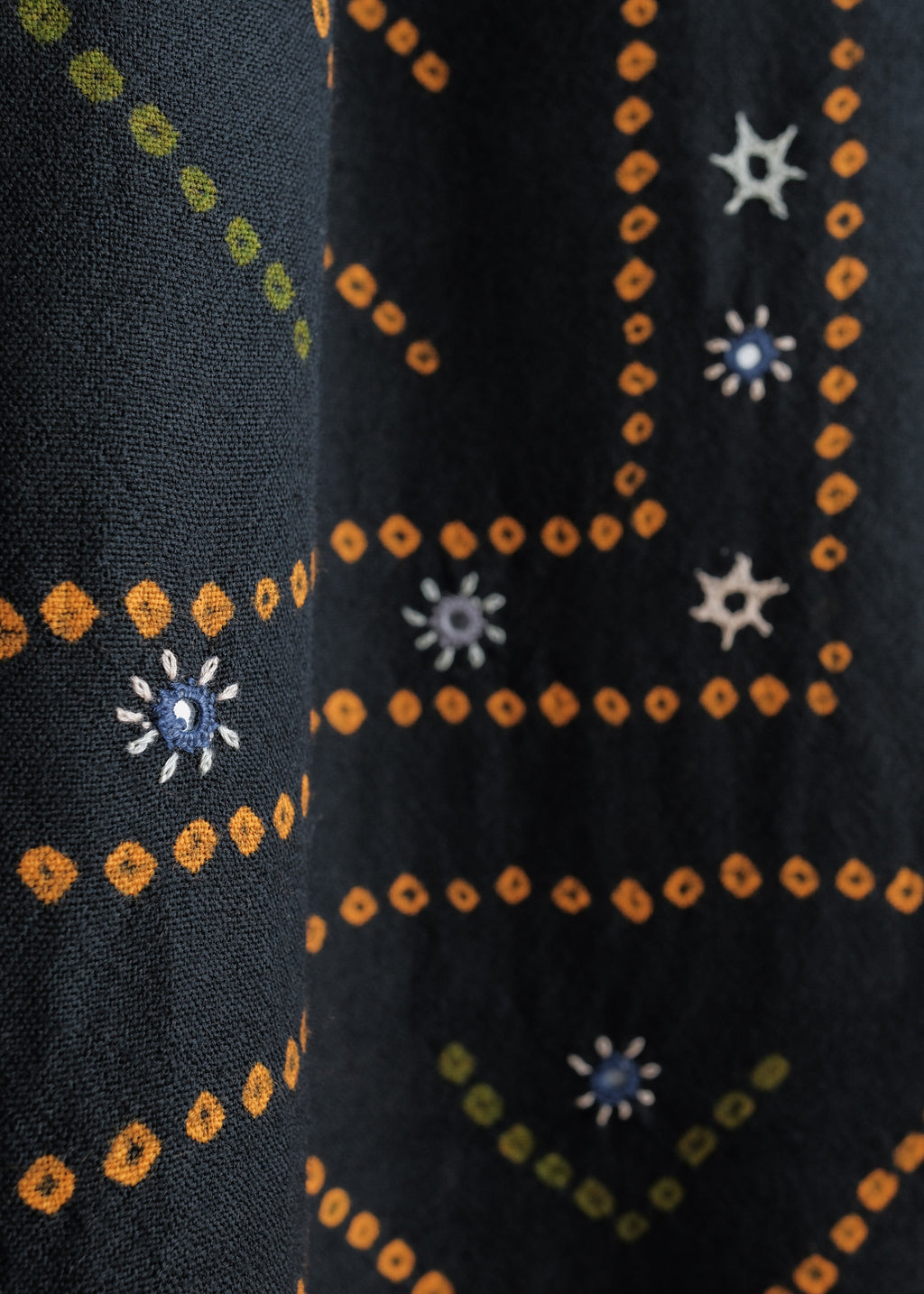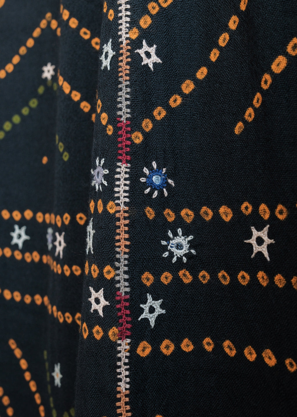 Process:  Handwoven wool, bandhani tied (shibori) and dyed, and hand embroidered by village artisans in Kachchh, India.