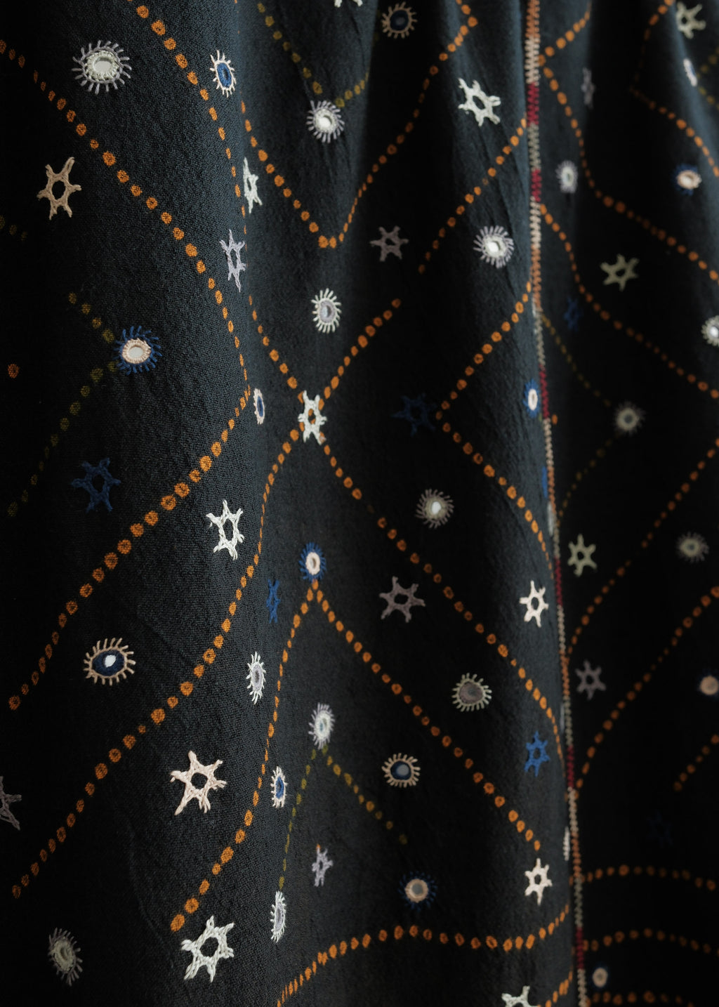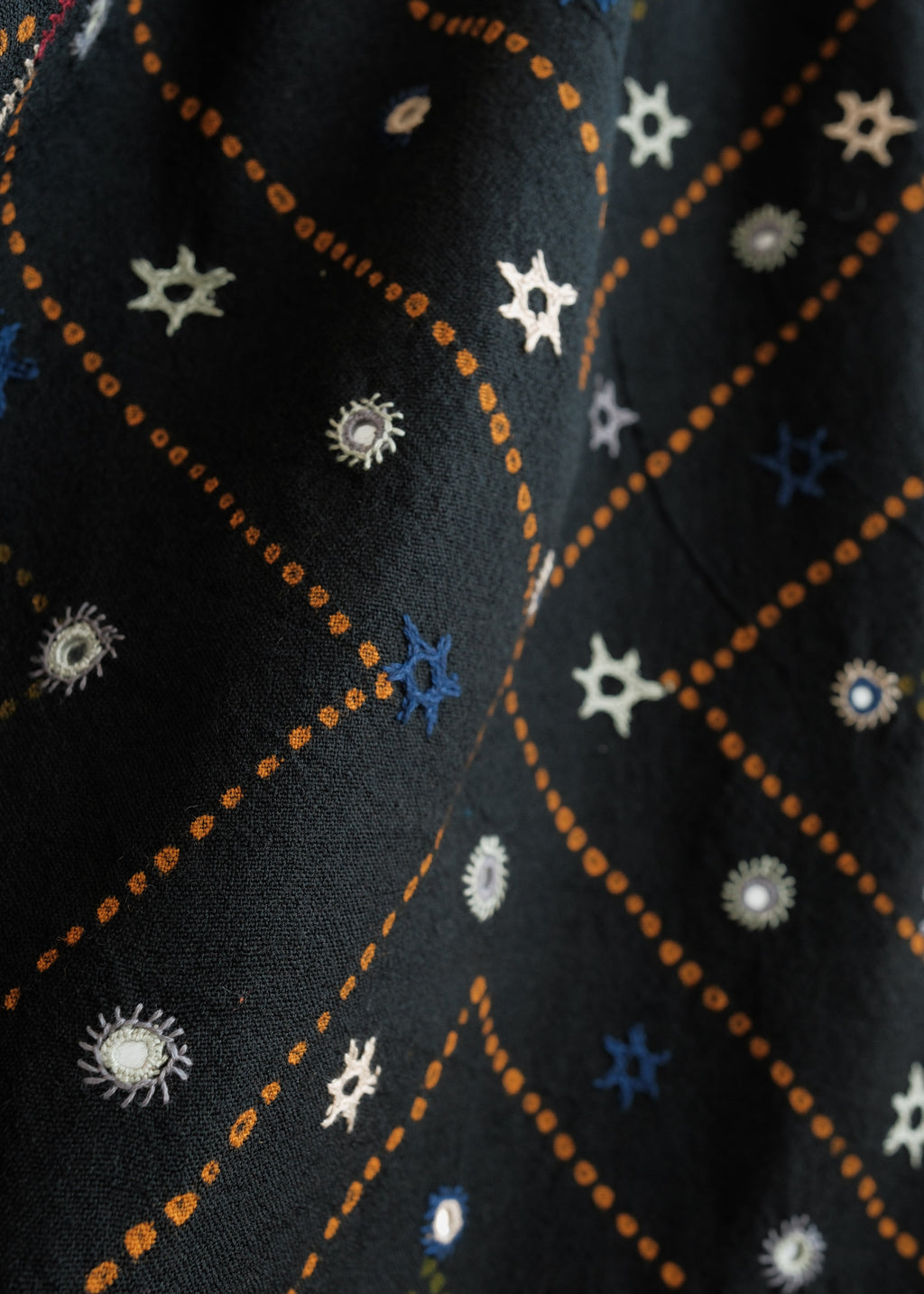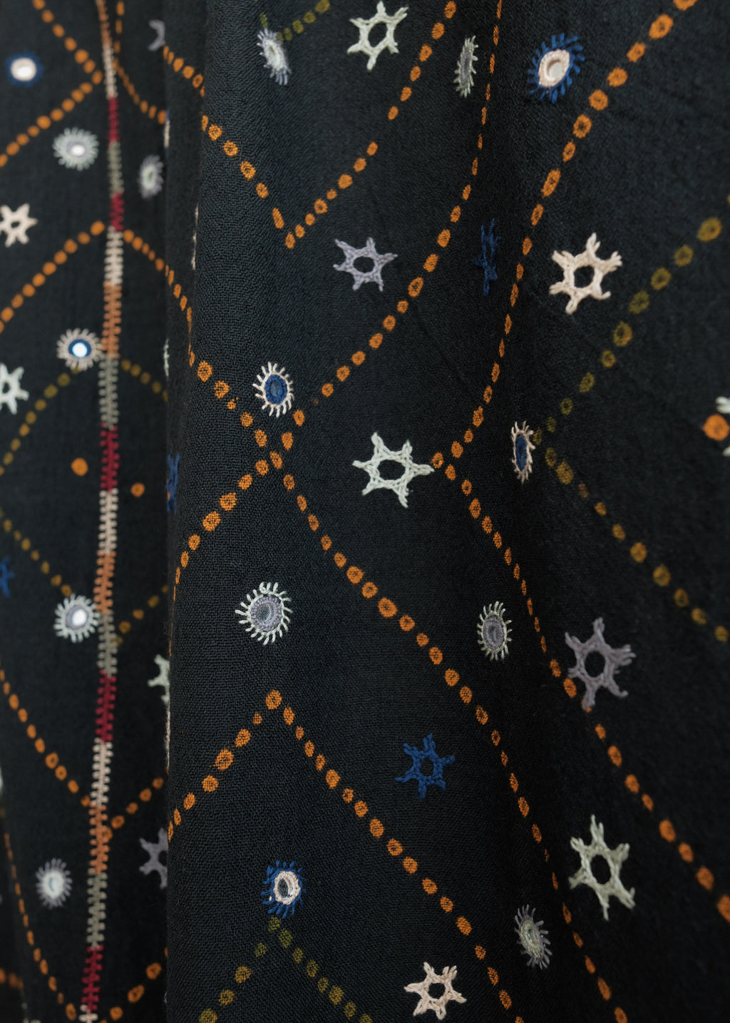 Process:  Handwoven wool, bandhani tied (shibori) and dyed, and hand embroidered by village artisans in Kachchh, India.