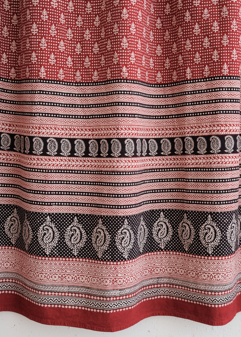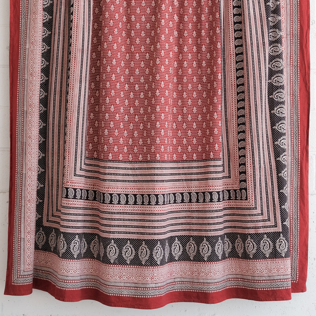 The impact of Bagh block prints comes from the dramatic use of red, black and white; a style which originates with the Bhil and Bhilala cultures of central India. Highly recognizable Bagh prints are a bold evolution of the block printer’s art.